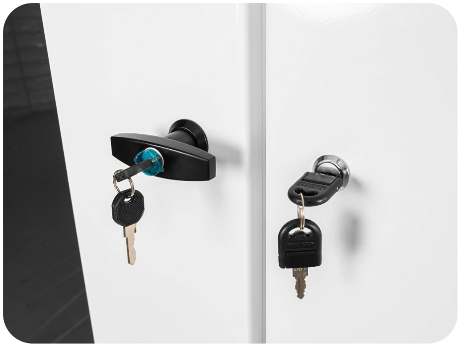 Максимальная безопасность вашего оборудования гарантирована: каждый отсек шкафа оснащен замками, запирающимися на ключ, обеспечивая надежную защиту от несанкционированного доступа и сохраняя конфиденциальность.