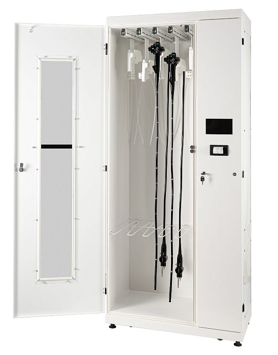 Шкаф предназначен для сушки и асептического хранения гибких волоконно-оптических и видео эндоскопов всех типов, прошедших предварительную обработку, с возможностью подачи сжатого воздуха в каналы эндоскопов и установленной системой подогрева циркулирующего внутри контура циркуляции воздуха. Обеспечивает оптимальные условия хранения за счет стерильной воздушной среды и встроенной системы контроля. Шкаф предназначен для применения в условиях лечебно-профилактических учреждений, научно-исследовательских институтов и других медицинских учреждений.