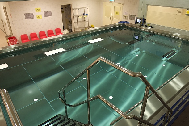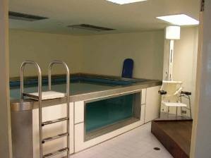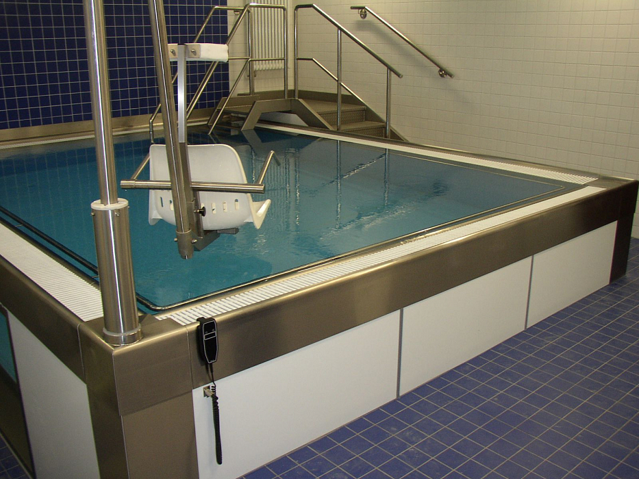 - относительно большой реабилитационный бассейн для групповых занятий с расширенным комплектом дополнительного оборудования для реабилитации в воде: потолочные подъемники, противоток, ручной подводный массаж, обзорные окна, пандус для пациентов на каталках, подводные тренажеры и пр. Размеры такого бассейна могут превышать 6 х 6 метров.
