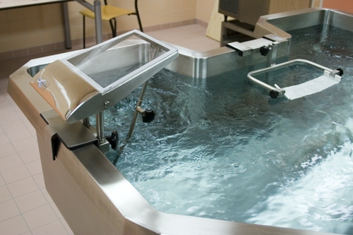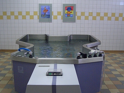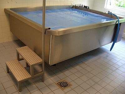 - Для экономии расхода воды, к ванне может быть подключена система водоподготовки, выполняющая механическую фильтрацию воды, ее подогрев, контроль хлорирования и pH воды. Фильтрация и очистка воды позволяет не только экономить на расходе воды (а полное наполнение ванны требует 1500 литров воды!), но и значительно сократить интервал времени между приемом пациентов.