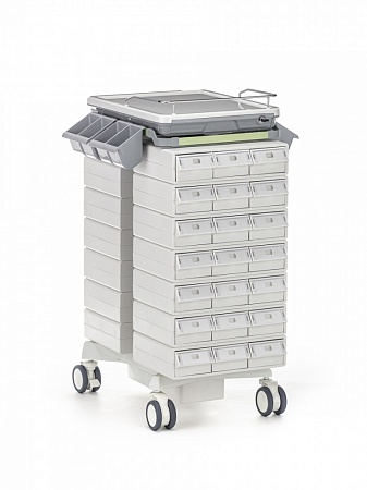 Функциональная инструментальная тележка F-19 для хранения лекарственных препаратов - отличное решение для терапевтических и реабилитационных отделений ЛПУ. Мобильная тележка, рассчитанна на широкий круг медицинских задач. Тележка оснащена 42 выдвижными ящиками и удобным ящиком для документов с функцией блокировки. Каждый ящик имеет возможность разделения на 3 ячейки. Дополнительные аксессуары, упрощают работу медперсонала и делают её гораздо более эффективной. Тележка оснащена ручкой для перемещения из ABS пластика. На столешнице установлен бортик из нержавеющей стали для предотвращения падения предметов.