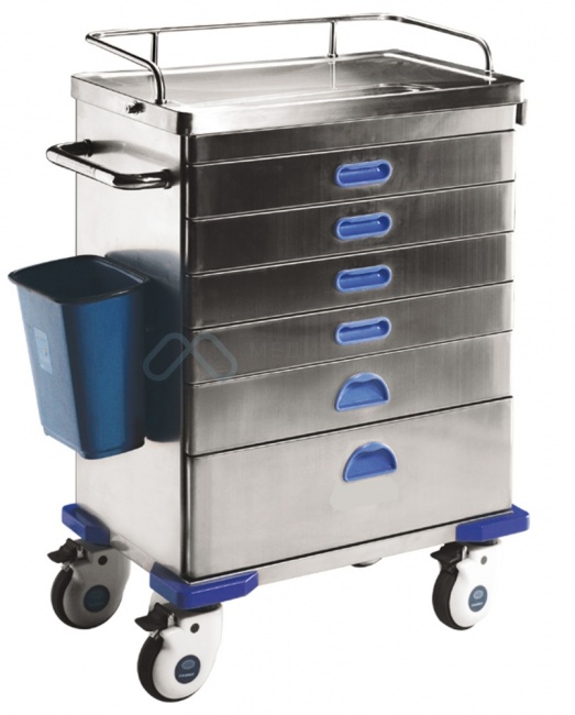 - Тележка анестезиолога оснащена 6 выдвижными ящиками, позволяющими хранить всё необходимое для оказания помощи больному. Каждый из ящиков снабжён эргономичной пластиковой рукояткой, утопленной в корпус.