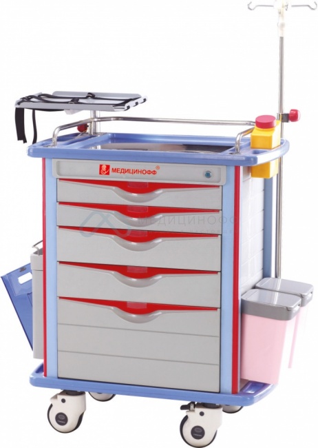 - В левой части тележки закреплена кассета для папок и файлов с документами. Справа размещаются два контейнера для использованных игл, упаковок и прочего мусора. По периметру тележку окружает защитный бампер из ABS-пластика.