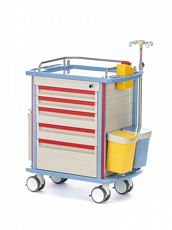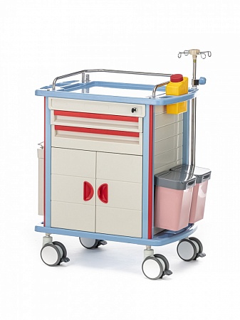 - Справа на тележке закреплена кассета для хранения документов, слева – два закрывающихся контейнера для игл, шприцев, упаковок и прочих отходов. Кроме того, в комплектацию данной модели входит пластиковый поднос.