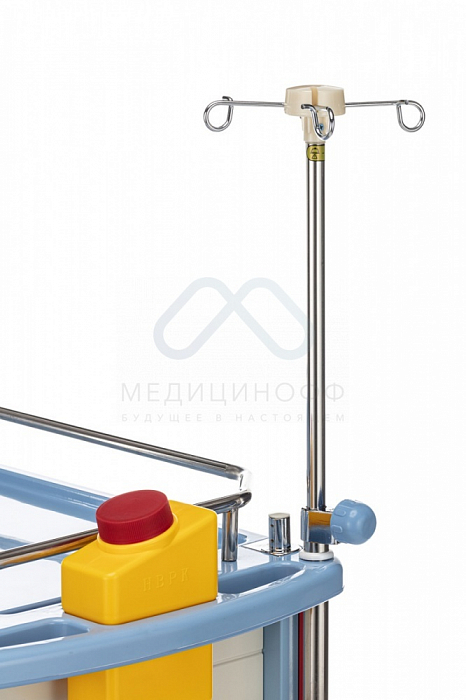 - Медицинская тележка укомплектована держателем для катетера, а также ремнями для фиксации кислородного баллона. Стальная инфузионная стойка, закреплённая с левой стороны, регулируется по высоте.