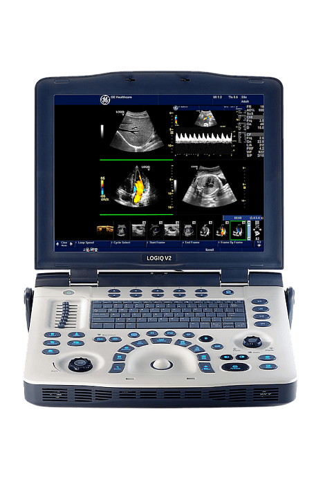 GE LOGIQ V2 компактная переносная ультразвуковая диагностическая система, предназначенная для визуализации органов брюшной полости, АК/ГИН, малых органов, сердечно-сосудистой системы, урологии, транскраниальных исследований.