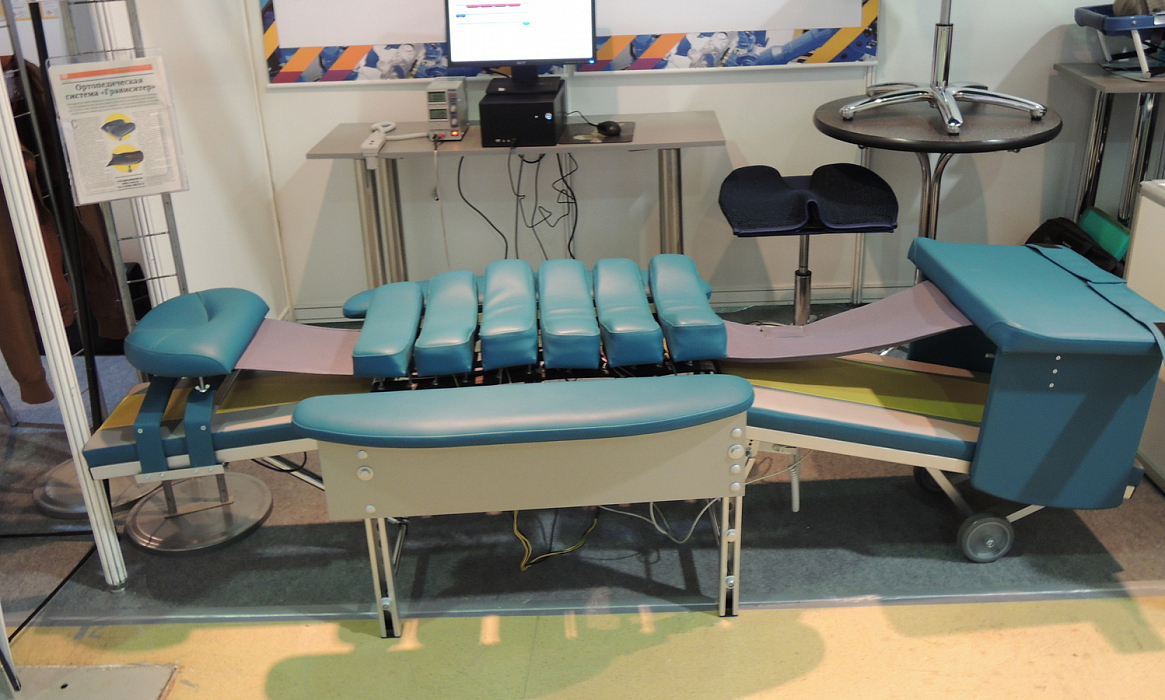 1. Устройство предназначено для профилактики и лечения позвоночника методом нетравматичного, аутогравитационного вытяжения с поддержкой оптимальной индивидуальной кривизны позвоночника, регулируемой микровибрации и теплового воздействия. Профессиональный вариант.2. Возможность расположения людей ростом до 2,2 метров без специальной предварительной подготовки устройства под ростовые характеристики. Опорная поверхность под спиной образована системой мягких профилированных элементов.