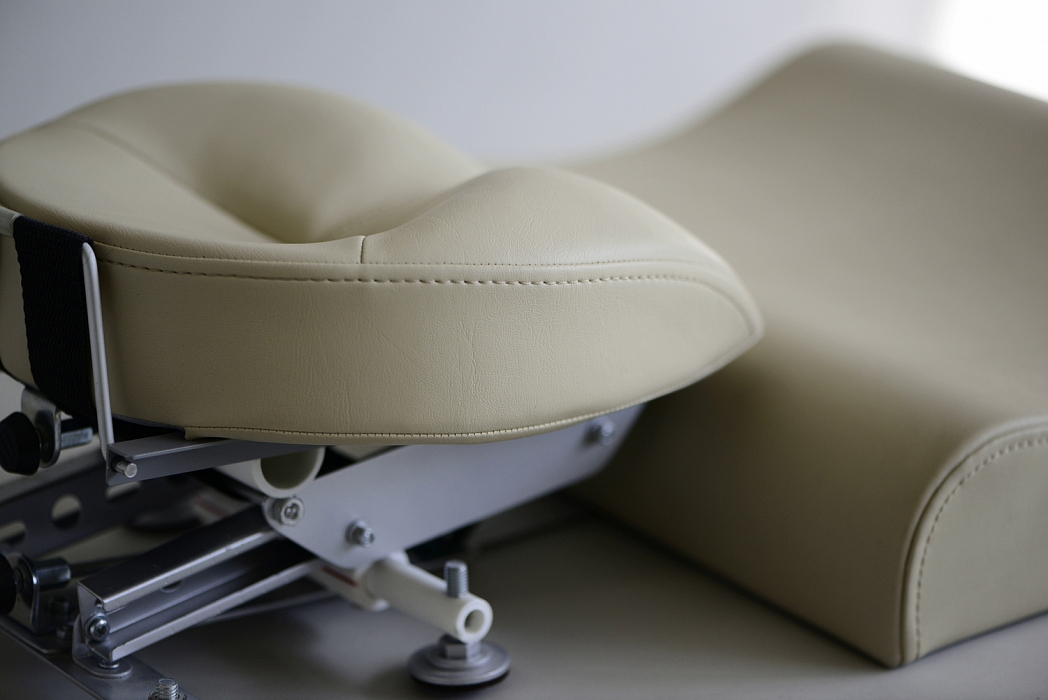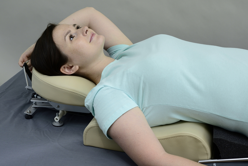Основное усилие вытяжения создается перемещением подголовника по наклонным направляющим под действием веса свободно лежащей на подголовнике головы. Противодействующим усилием является сила упругой реакции о край спинной подушки и силы трения между опорной поверхностью и различными участками тела.