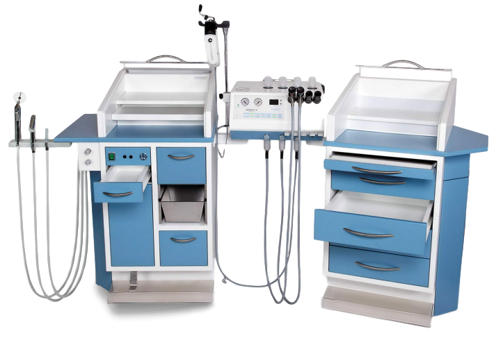 - Встроенная система распыления медикаментов и продувания сжатым воздухом (компрессор, ресивер - накопитель сжатого воздуха, от 3 до 9 распылителей медикаментов, металлическая хромированная рукоятка распыления)