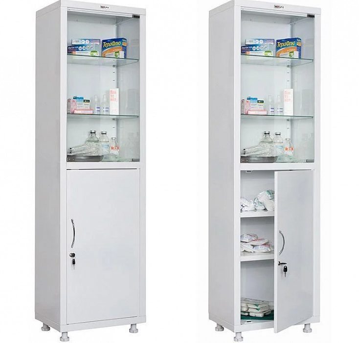 - Шкаф МД 1 1657/SG - из стали со стеклянной полкой, с одной «глухой» и одной стеклянной дверцей.