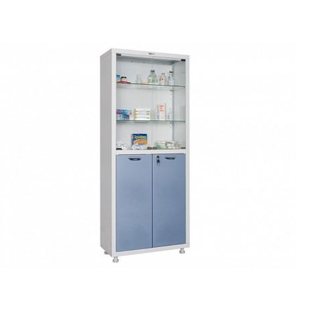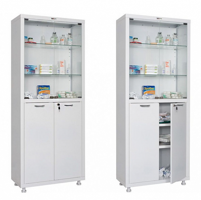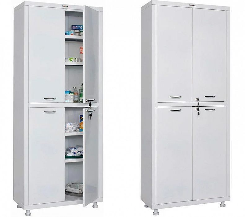 - Шкаф МД 2 1670/SG - из стали со стеклянной полкой, с двумя «глухими» и двумя стеклянными дверцами.