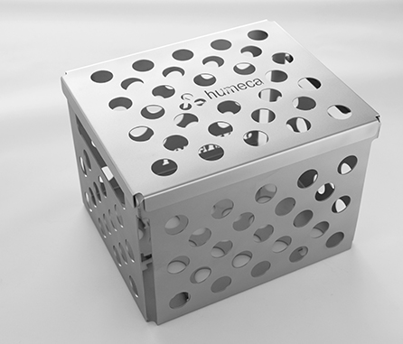 Кожный перфоратор медицинский Humeca снабжен уникальным пружинным механизмом, который предотвращает чрезмерное давление лезвий на подложку во время перфорации. 50 лезвий диаметром 36 мм на перфораторе кожи установлены на ось, с интервалом 1.5 мм между линиями пересечения. Для того чтобы очистить и дезинфицировать ось с ножами можно открыть кожный перфоратор. Перфоратор медицинский нужно очистить и стерилизовать паром перед использованием.