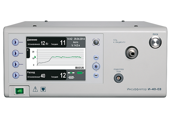 - Электронный инсуффлятор экспертного класса И-40-03 "ЭФА-М" с автоматическим определением границы напряженного пневмоперитонеума, позволяющий выполнять вмешательство с поддержанием абдоминального давления на комфортном для хирурга и максимально безопасном для пациента уровне, при котором минимальны изменения pH и газового состава крови, исключены нарушения регуляции сердечного ритма, тромбофлебиты вен нижних конечностей, тромбоэмболические осложнения, осложнения со стороны органов дыхания, связанные с использованием напряженного пневмоперитонеума.