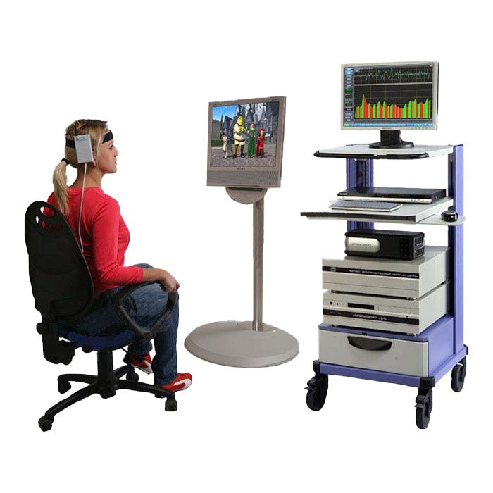 Пациент находится перед экраном монитора, на котором демонстрируется фильм. У него регистрируют электроэнцефалограмму (ЭЭГ) над проекцией зрительной коры мозга (на рисунке справа – синий график). С помощью специального математического анализа вычисляются колебания возбуждения нейронов зрительной коры, которые характеризуют повышение качества зрения (на рисунке – зоны зелёного цвета) или его снижение (красные зоны).