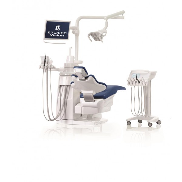 Нижняя подача или подкатной модуль Cart, с элементом врача, элементом ассистента, гидроблоком, сенсорный элемент управления с большим дисплеем и с данными по индивидуальному программированию, многофункциональной педалью управления функциями кресла, инструментов и мультимедийной системы, функцией VACUstop для экстренной остановки вакуума, светодиодным светильником KaVo 540 LED, функциями автоматического промывания и дезинфекции систем, в различных цветовых гаммах.