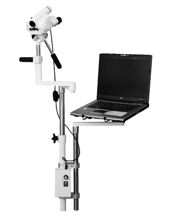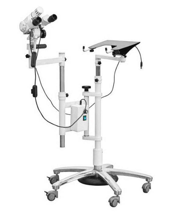 Бинокулярный окуляр с возможностью настройки межзрачкового расстояния и диоптрийной коррекции адаптируется под индивидуальные особенности зрения врача. Устройство обладает эргономичной конструкцией и устойчивой базой, что делает его удобным и надежным в использовании.