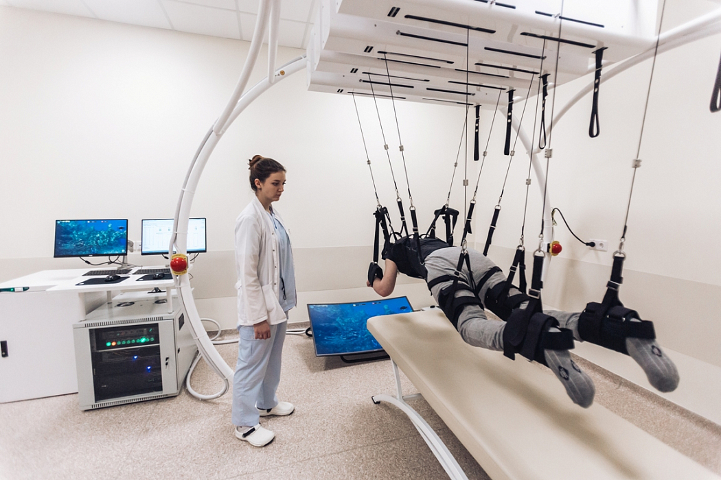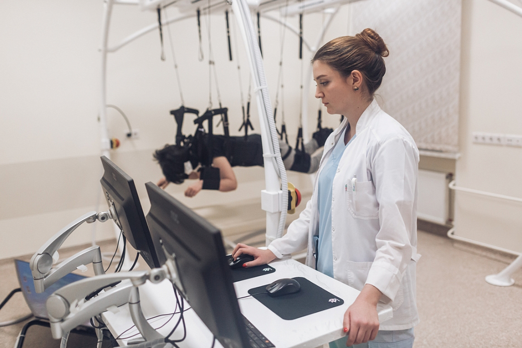 - При помещении пациента в безопорное состояние на комплексе, происходит снятие всех импульсов с подошв, мышц, связок, которые сигнализируют о необходимости бороться с гравитацией: