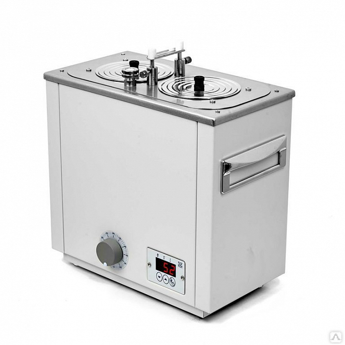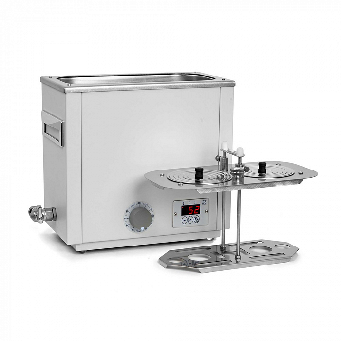 Баня оснащена легко извлекаемой корзиной с подвижным дном для размещения лабораторной посуды различного размера и стальными концентрическими кольцами для ее уплотнения.