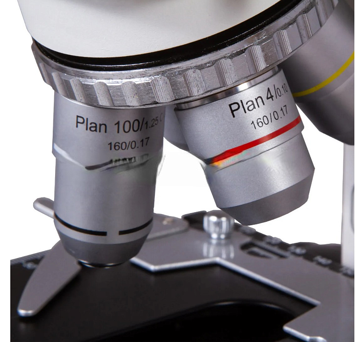 В микроскопе используется планахроматическая оптика, которая значительно выравнивает поле зрения, убирает оптические искажения, улучшает контрастность и цветопередачу. Мельчайшие детали структур видны четко и ясно, наблюдения можно вести на увеличении от 40 до 1000 крат. В комплекте идут следующие оптические аксессуары: широкопольные окуляры с 10-кратным увеличением и диоптрийной коррекцией и четыре объектива разной кратности. 40-кратный и 100-кратный объективы снабжены пружинящими оправами. Для наблюдений иммерсионным методом используется 100-кратный объектив. Все аксессуары имеют защитное антигрибковое покрытие.