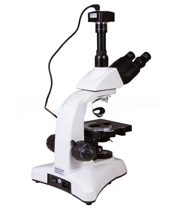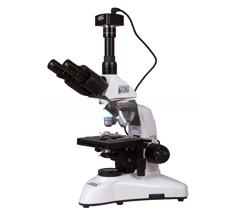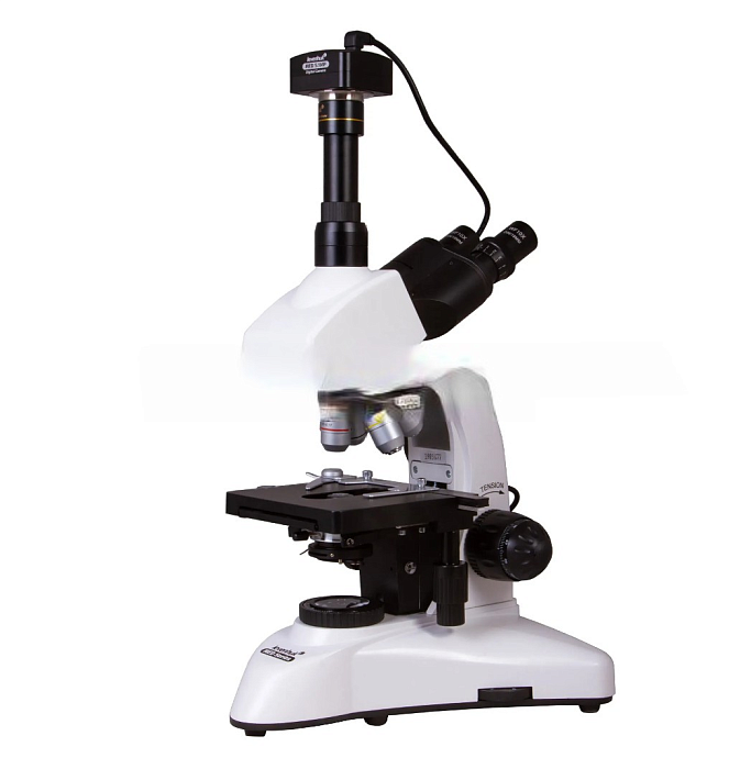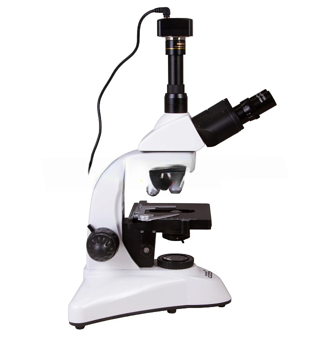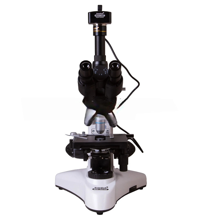 Насадку можно поворачивать на 360°. Визуальная часть наклонена под 30-градусным углом, а окулярная трубка для установки цифровой камеры расположена вертикально. Есть делитель светового потока. Камера снабжена чувствительным сенсором 5,1 Мпикс, может делать одиночные фотографии и снимать видеоролики. Разрешения снимков хватает для профессиональных исследований и создания подробных цифровых архивов. Тринокулярный микроскоп с цифровой камерой – это отличная возможность облегчить длительную работу в лаборатории. Картинка с объектива микроскопа выводится на внешний экран, что избавляет от необходимости постоянно смотреть в объективы, напрягая зрение и мышцы плечевого пояса.