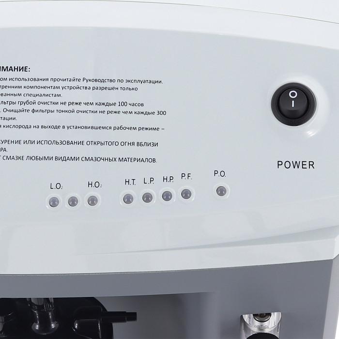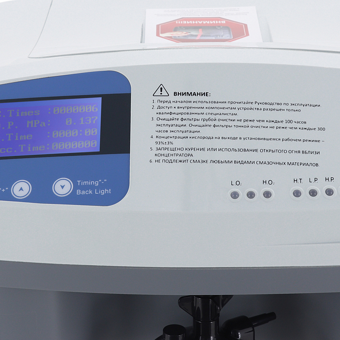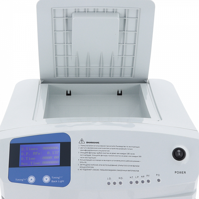 - Прибор прост и удобен в эксплуатации, имеет интуитивно понятную систему управления. Информация о параметрах работы концентратора отображается на ЖК-экране (количество включений, давление, таймер, суммарное время работы).