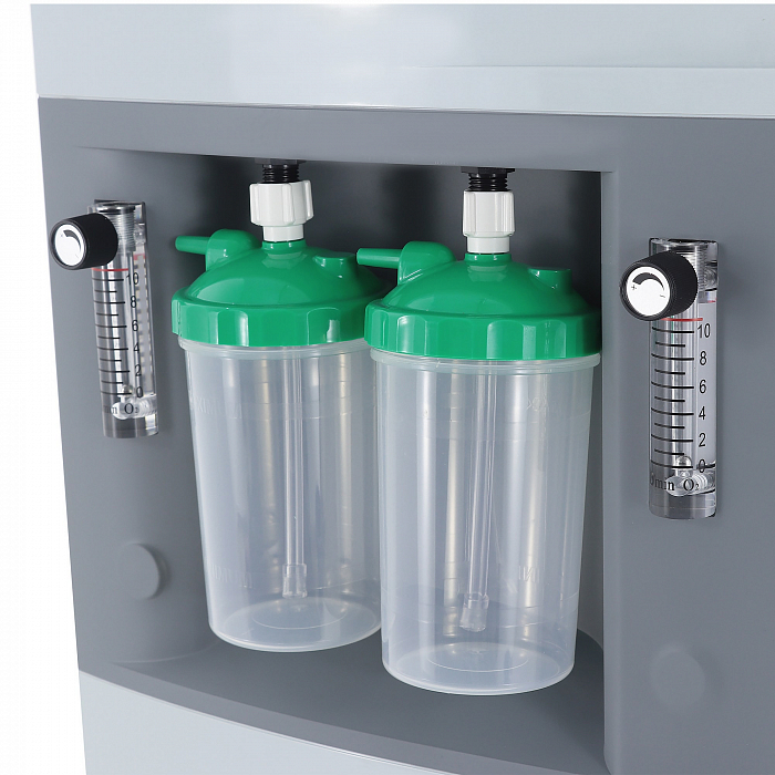 • В корпусе изделия предусмотрен эргономичный отсек для хранения комплектующих и аксессуаров. Это решение позволяет поддерживать порядок в больничной палате, обеспечивает удобство при хранении, транспортировке и эксплуатации оборудования. Для лёгкого и комфортного перемещения концентратор снабжён четырьмя самоориентирующимися колёсами.