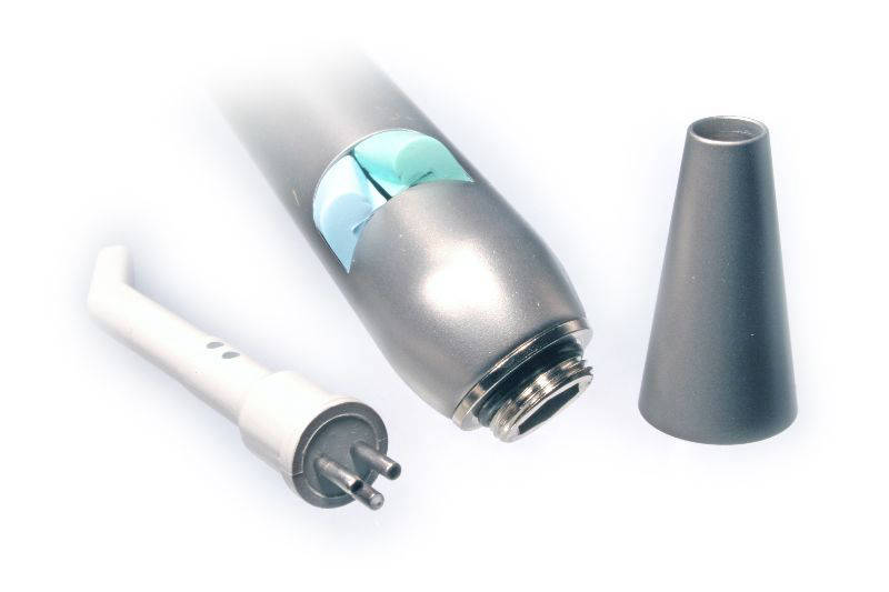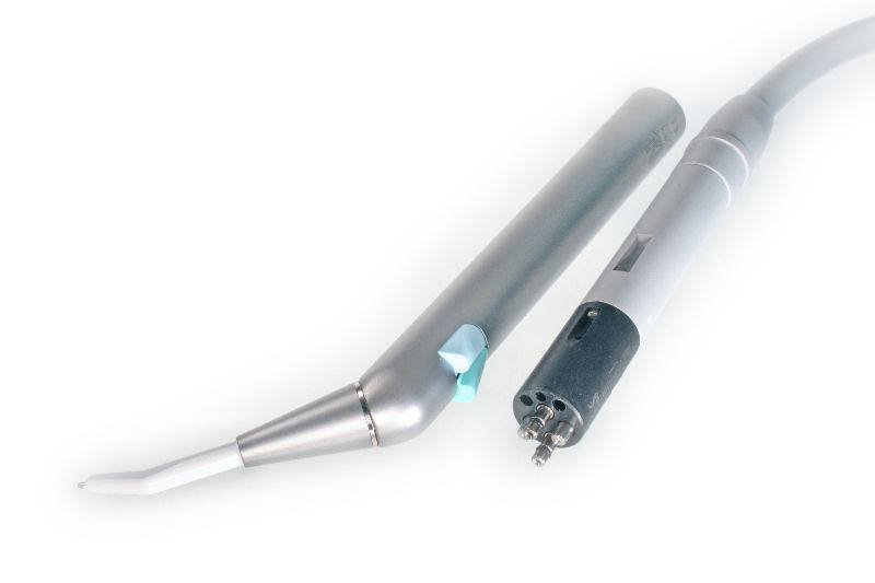 Угловой вариант от прямого отличается только формой кожуха. Кожухи взаимозаменяемы. Приобретя к угловому шприцу прямой кожух позволяет расширить возможности применения данного шприца вода-воздух.