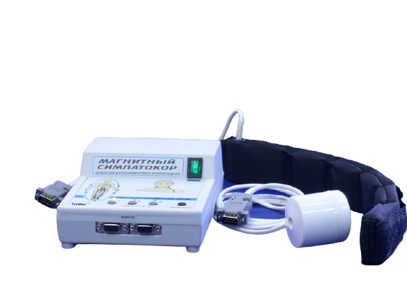 - Аппарат "МАГНИТНЫЙ СИМПАТОКОР" предназначен для коррекции системы регуляции мозгового кровообращения воздействием на левые и правые проекции верхних шейных ганглиев симпатической нервной системы пациента с помощью периодического блокирования активности ганглиев электрическим током, наведённым бегущим магнитным полем (БМП) за счёт эффекта самоиндукции.