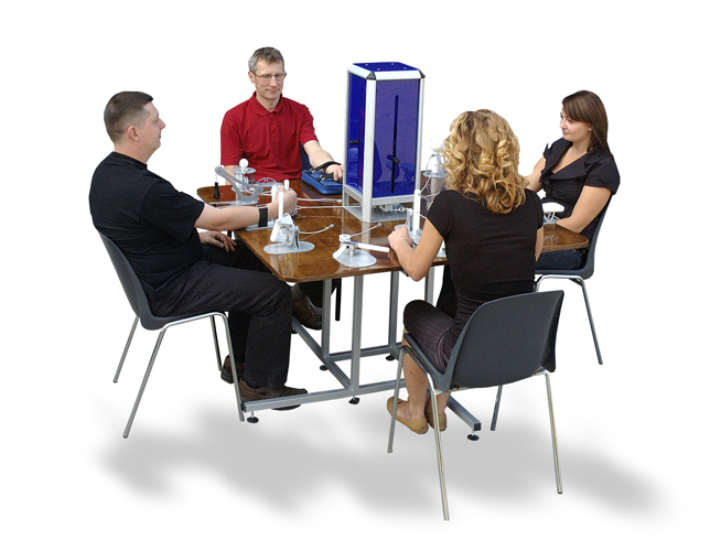 На рабочей поверхности стола Manualex расположены 12 отдельных тренажеров (по три с каждой стороны стола):