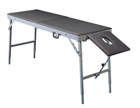 - Портативный массажный стол имеет надежную конструкцию, складывающуюся в чемоданчик, регулируемые ножки, подголовник с отверстием для лица.