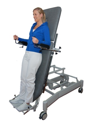 - Вертикализатор допускает перемещение внутри клиники с пациентом "на борту". Наклон опор для ног можно регулировать.