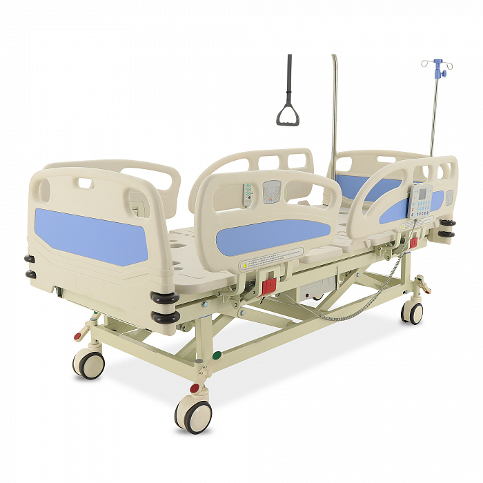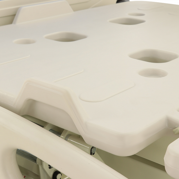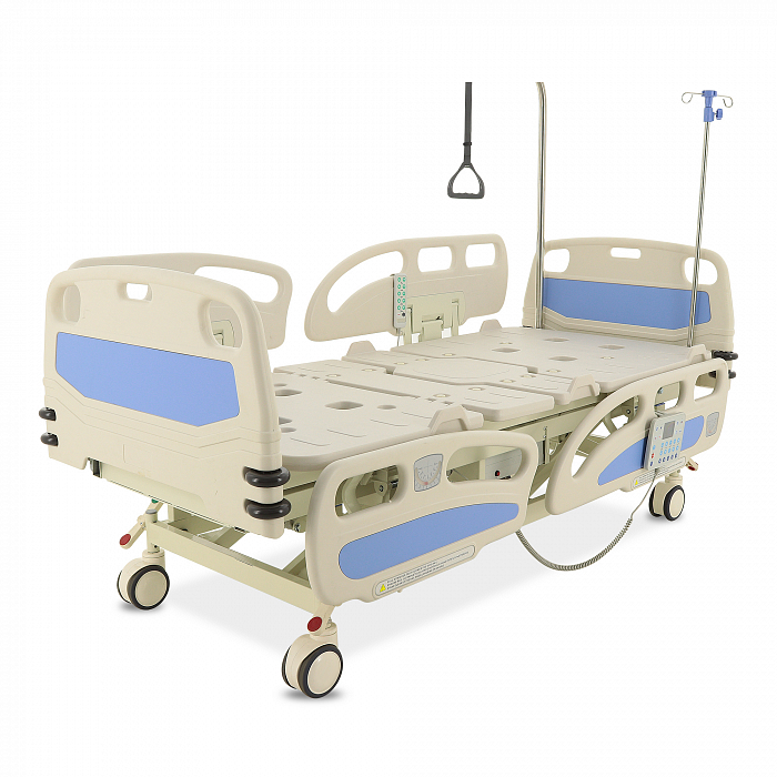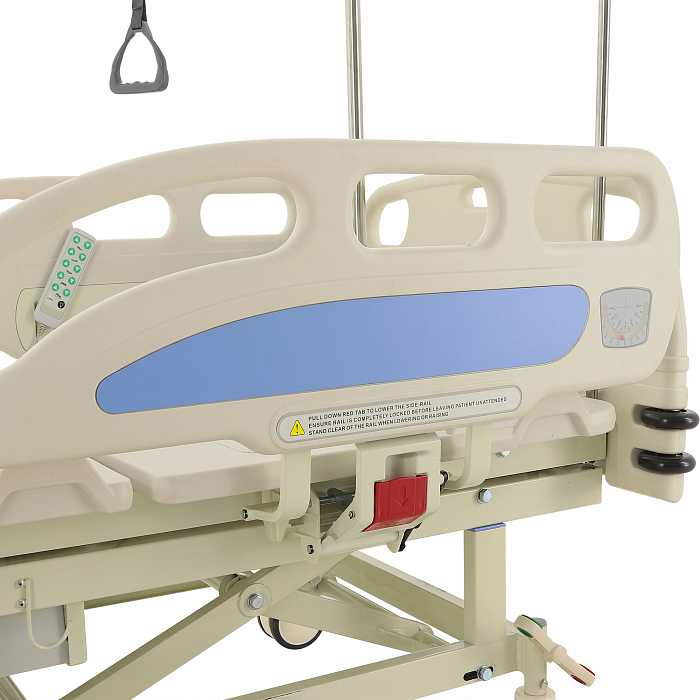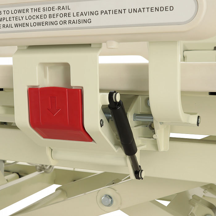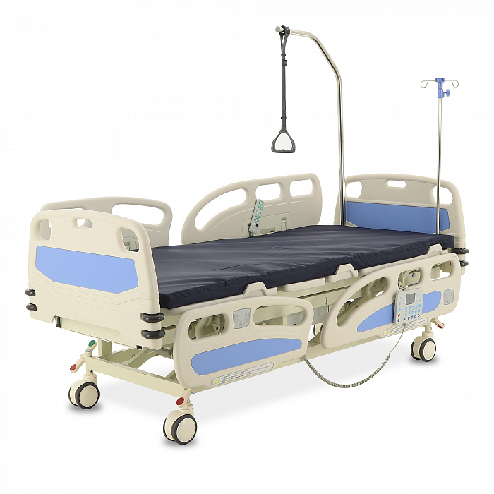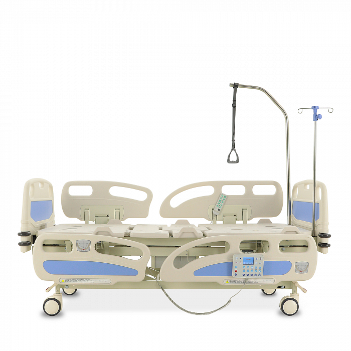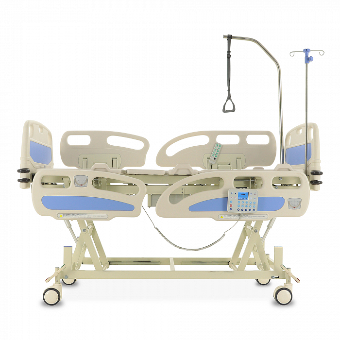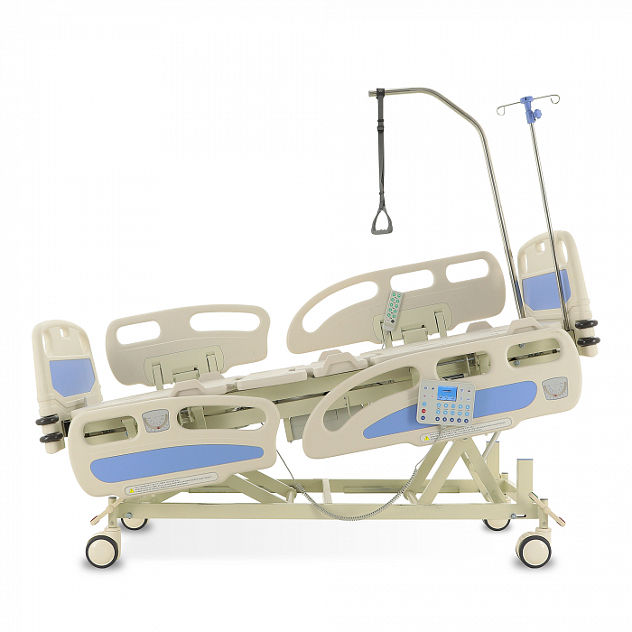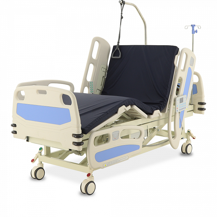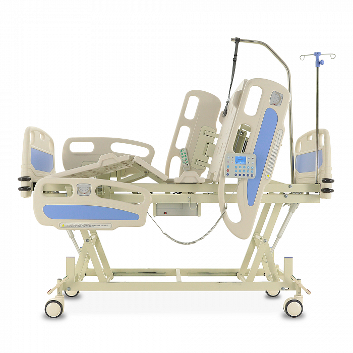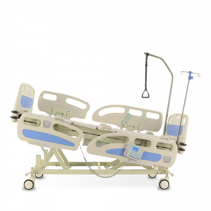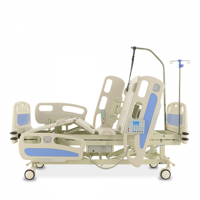 Торцевые спинки легко снимаются, это обеспечивает быстрый доступ к пациенту в экстренных ситуациях. Боковые ограждения имеют плавный и бесшумный механизм складывания. В модели предусмотрены функции СBR, Тренделенбург/Антитренделенбург, автоконтур, авторегрессия, а также звуковая сигнализация при покидании больным кровати. Функция «авторегрессия» позволяет удлинить тазовую секцию на 6 см, это снижает давление на отдельные участки тела пациента и предотвращает образование пролежней. Кровать имеет телескопическую инфузионную стойку, дугу для подтягивания, встроенные весы.
