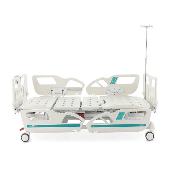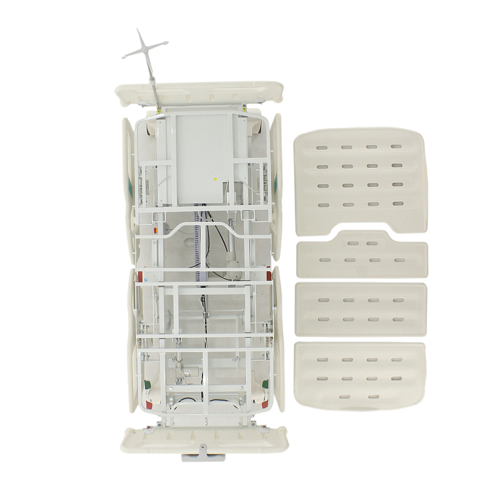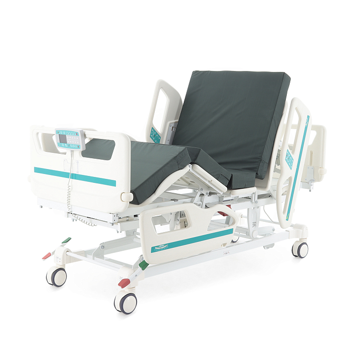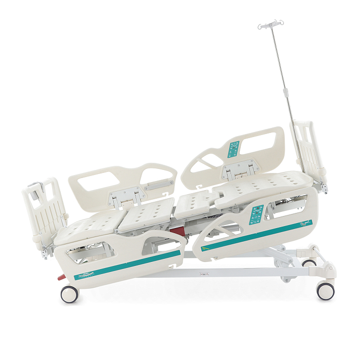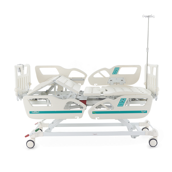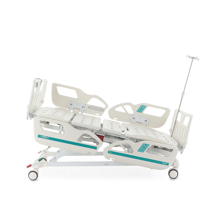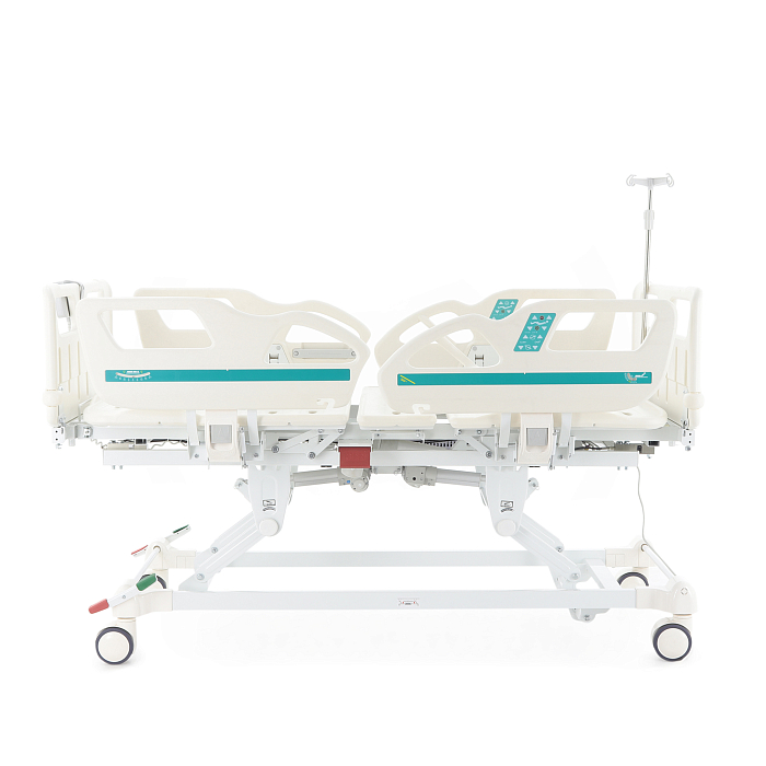 Комплектация: ложе, каркас, комплект спинок, матрас 4-х секционный (190*87,5*10 см), 4 электропривода, комплект боковых ограждений, ПУ для медперсонала, инфузионная стойка, крючки для мочеприемников - 2шт