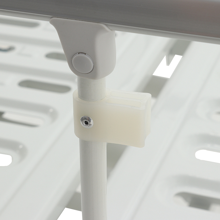 - 2 складных боковых ограждения запатентованной травмобезопасной конструкции, состоит из основания, L-образных вертикальных опорных стоек, поручня и механизма фиксации ограждения в верхнем положении