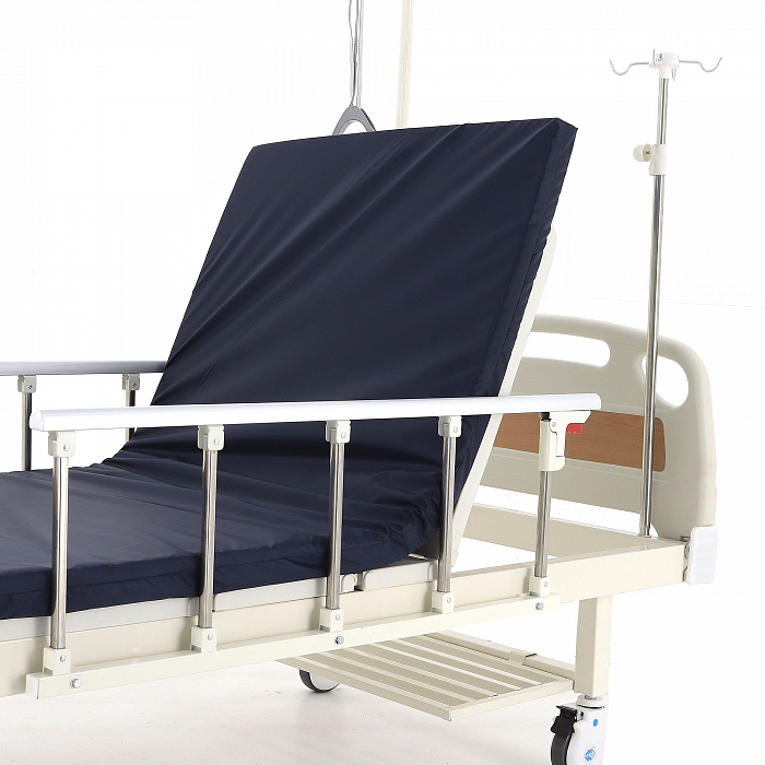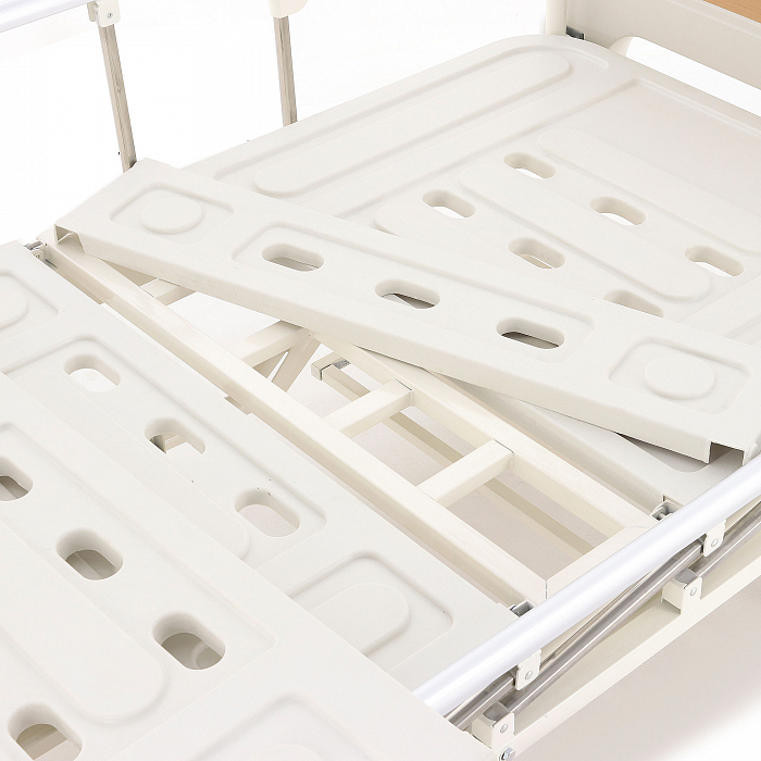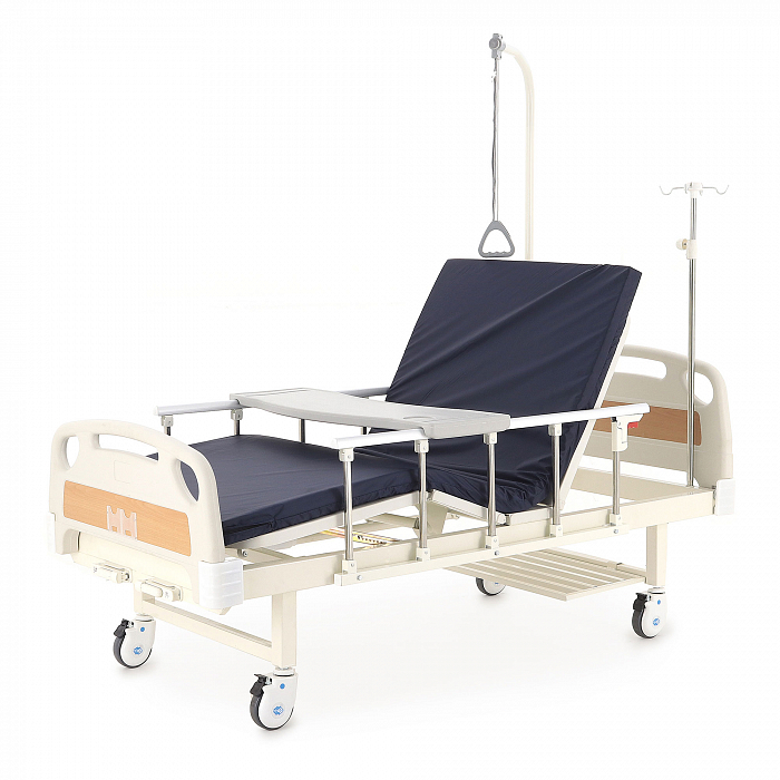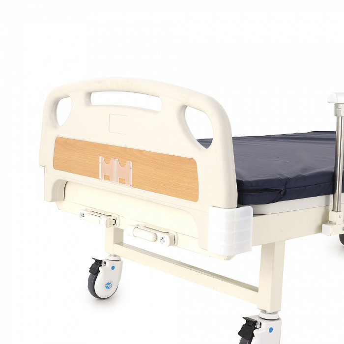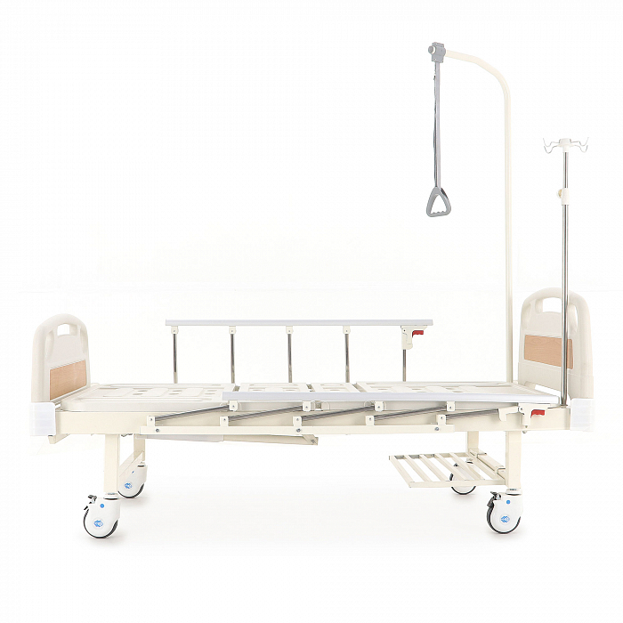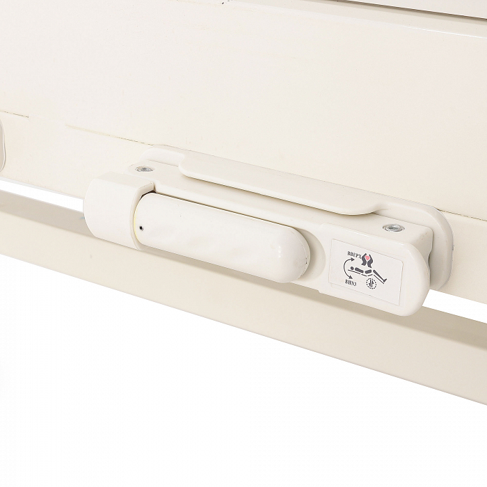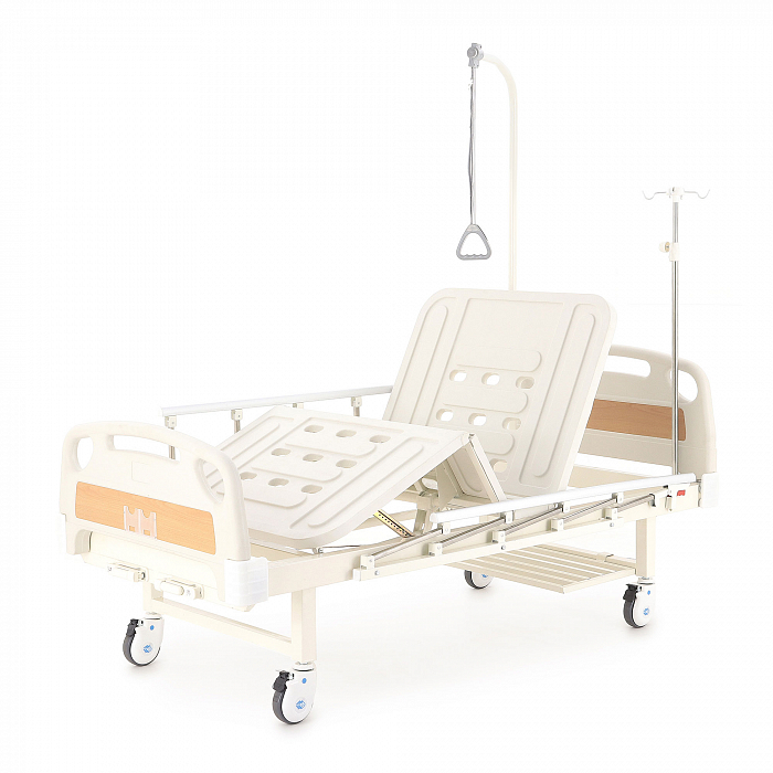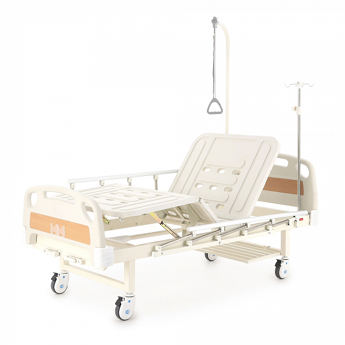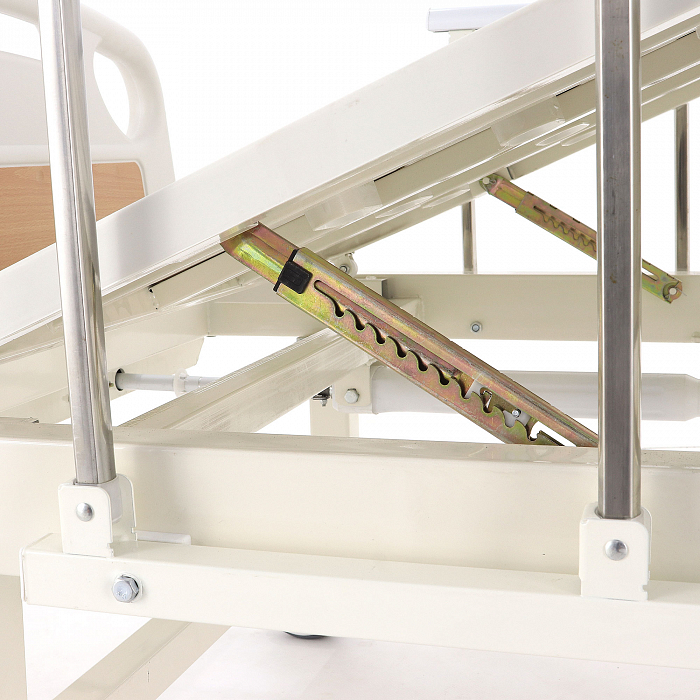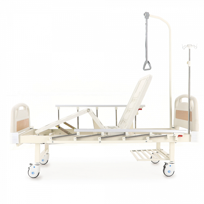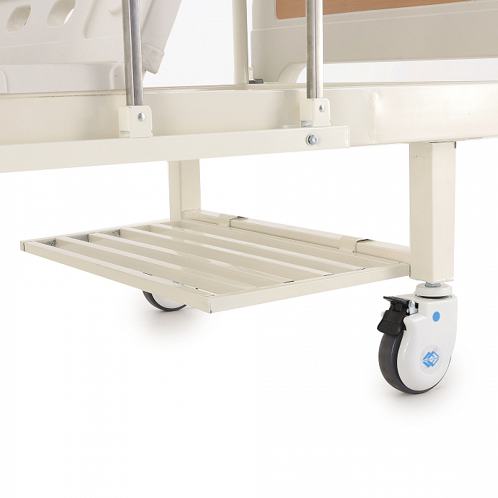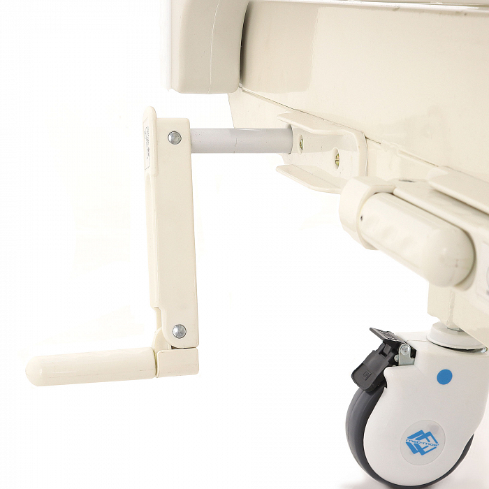 Кровать имеет механический привод и четыре секции, угол наклона которых можно регулировать в зависимости от потребностей больного. Модель выполнена из стали, поверх которой находится кожух из прочного пластика.