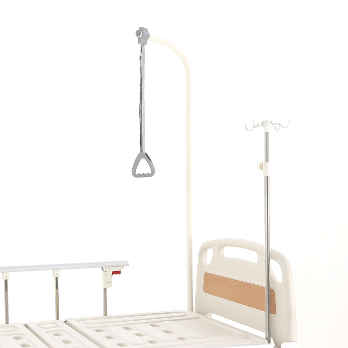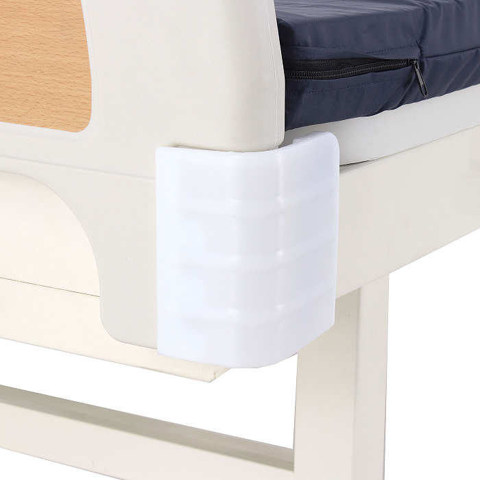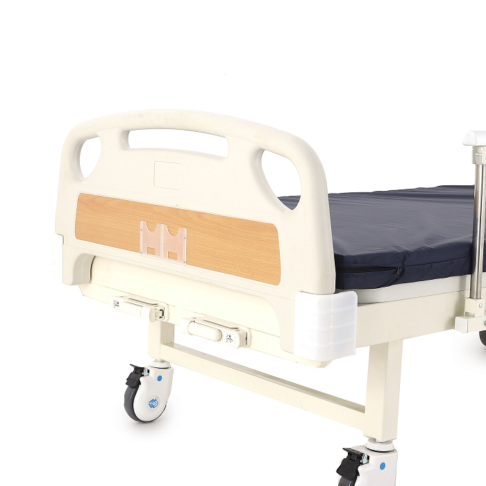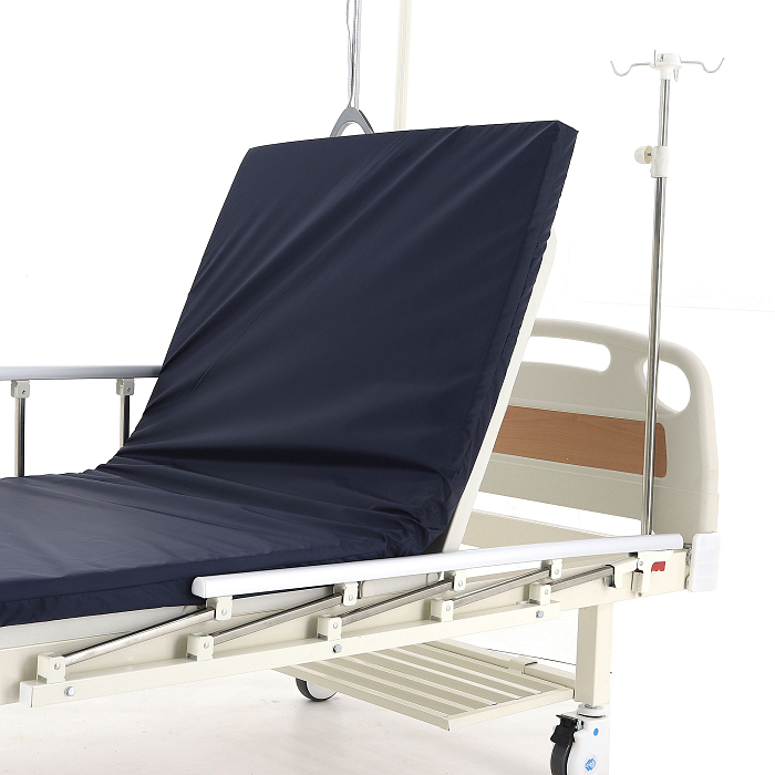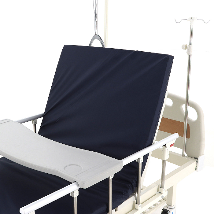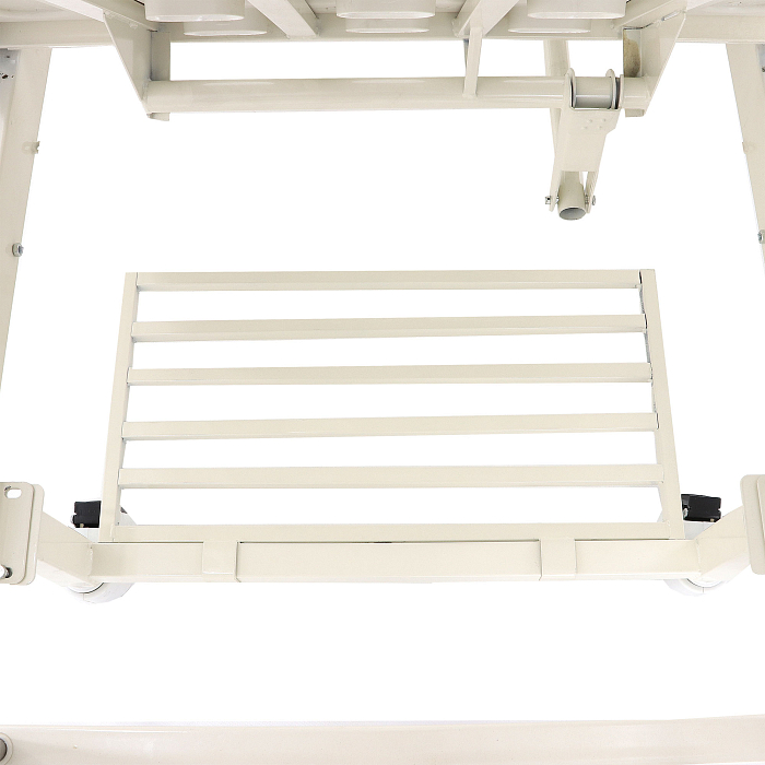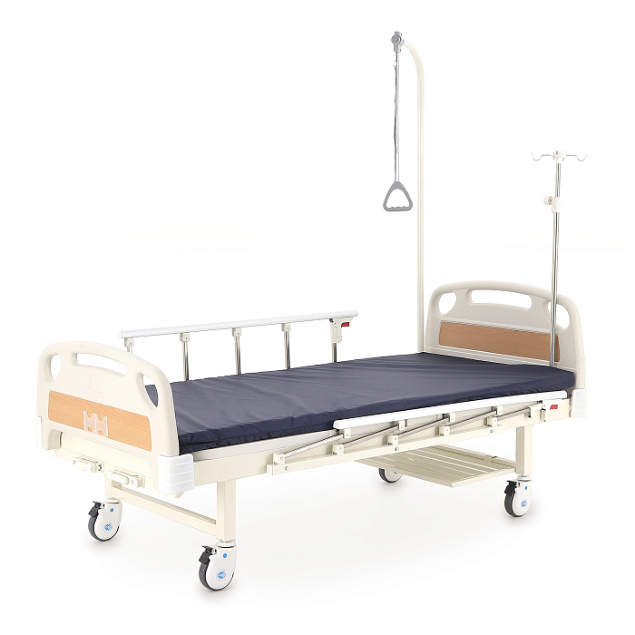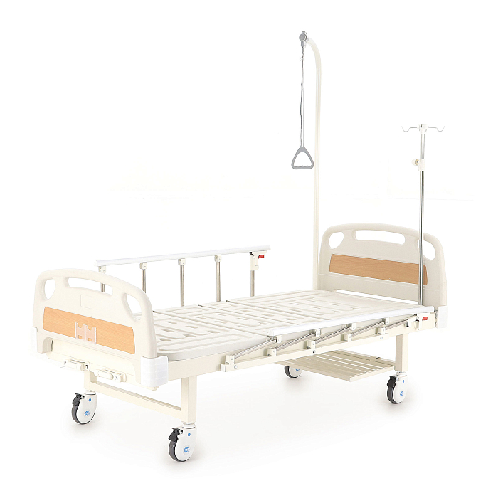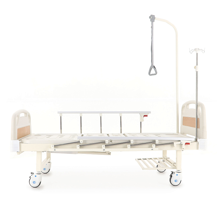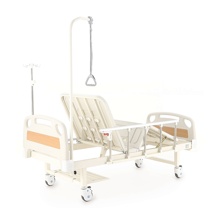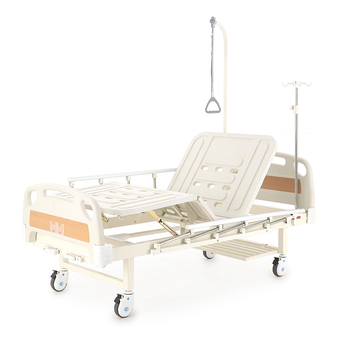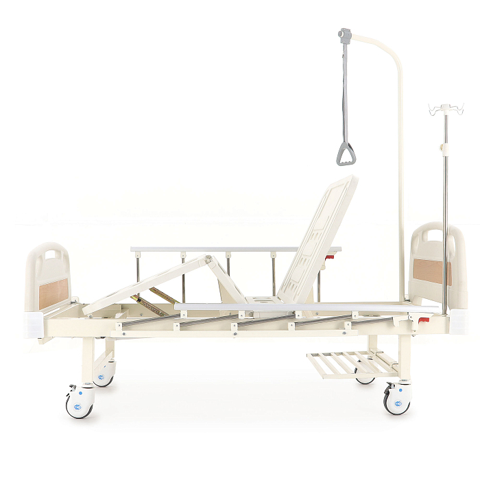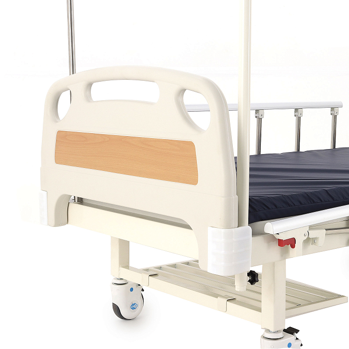 Кровать имеет механический привод и четыре секции, угол наклона которых можно регулировать в зависимости от потребностей больного. Модель выполнена из стали, поверх которой находится кожух из прочного пластика.