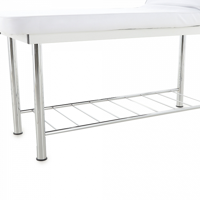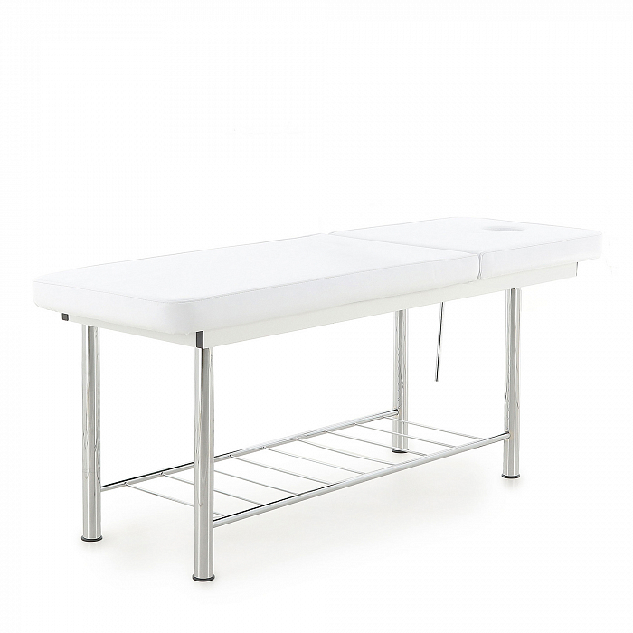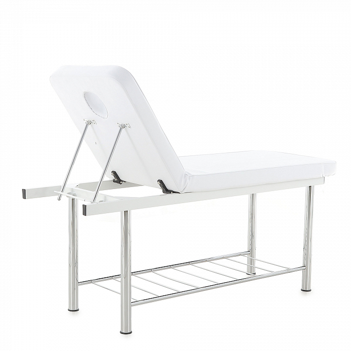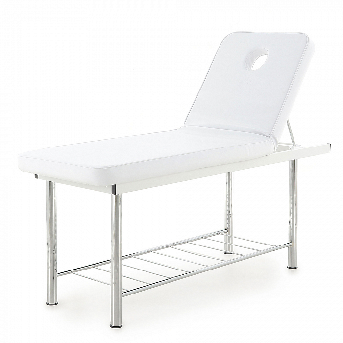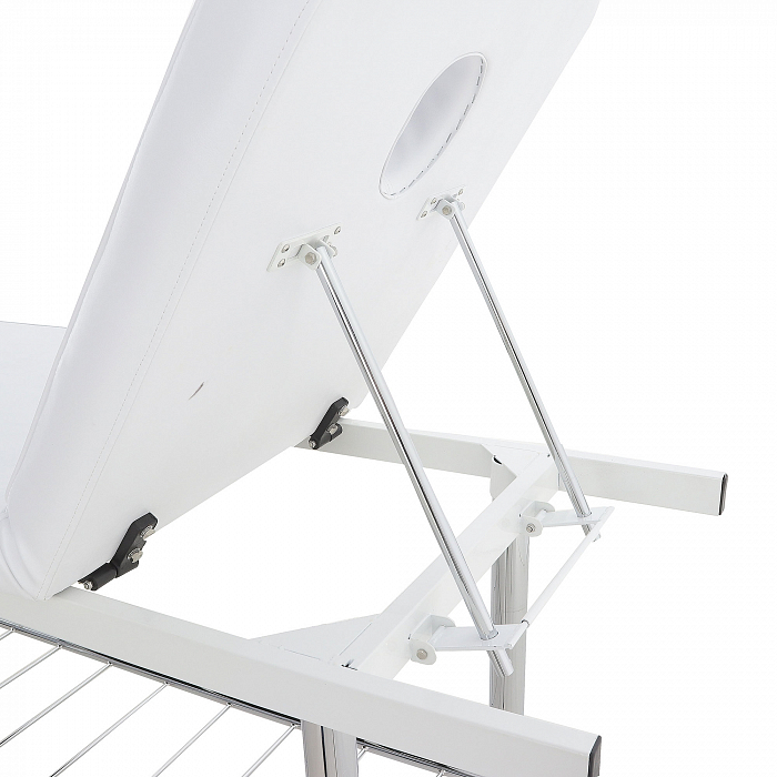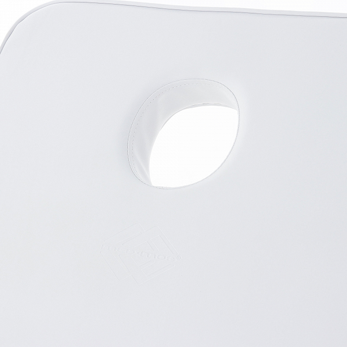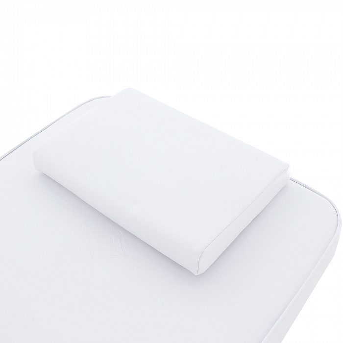 - Односекционный ложемент с отдельным вырезом для лица обтянут высококачественным винил-люксом, стойким к истиранию и механическим повреждениям. Под ним находится слой упругого поролона толщиной 5 см, создающего оптимальную жесткость ложа для принятия процедур. Белый цвет виниловой обивки пусть вас не смущает — трудностей при уходе за ним этот факт не создаст.
