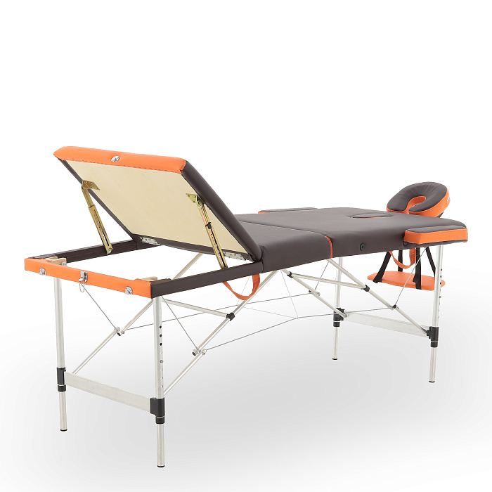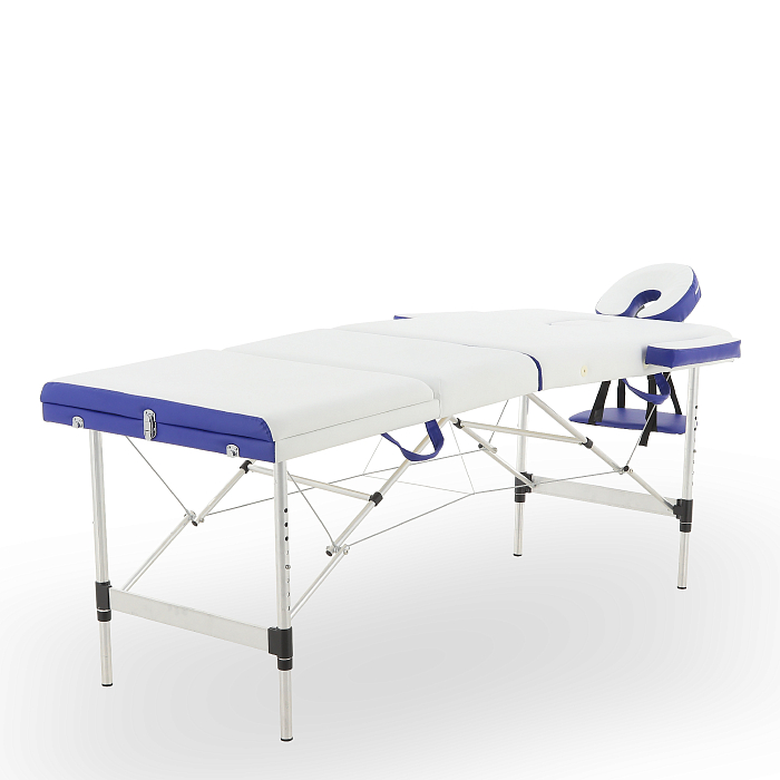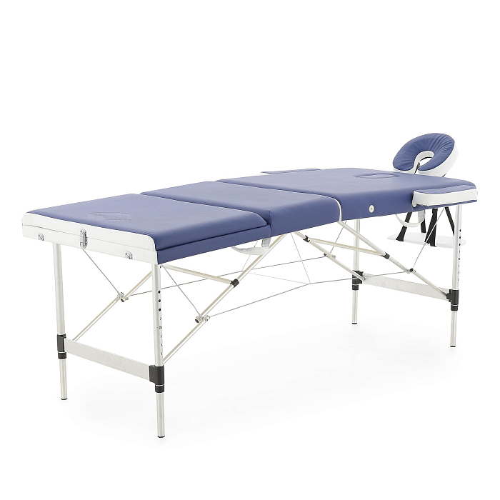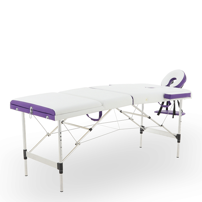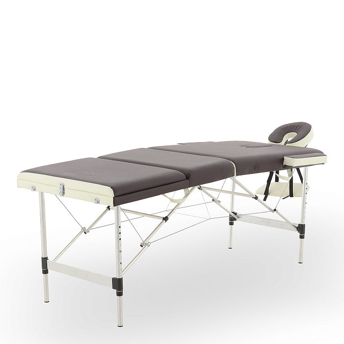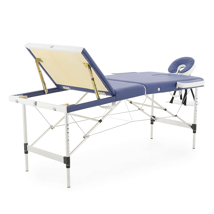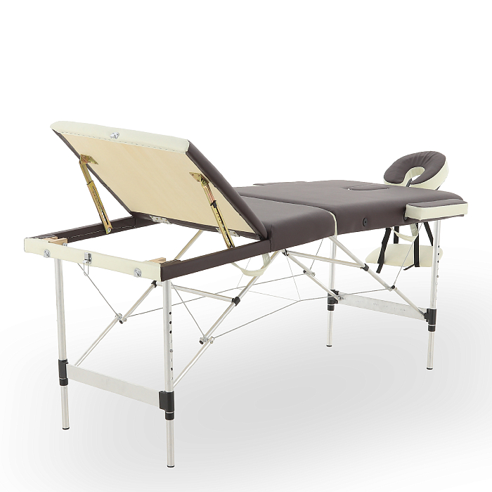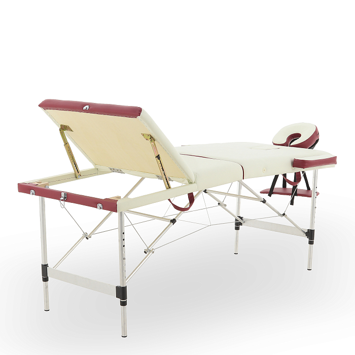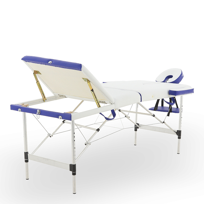 - Трёхсекционный массажный стол, рама которого изготовлена из прочного алюминия. Выдерживает повышенную нагрузку до 220 кг, при собственном относительно небольшом весе.