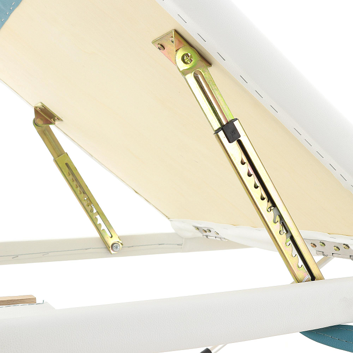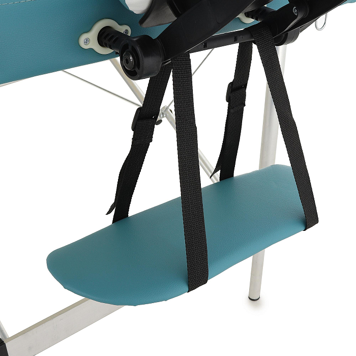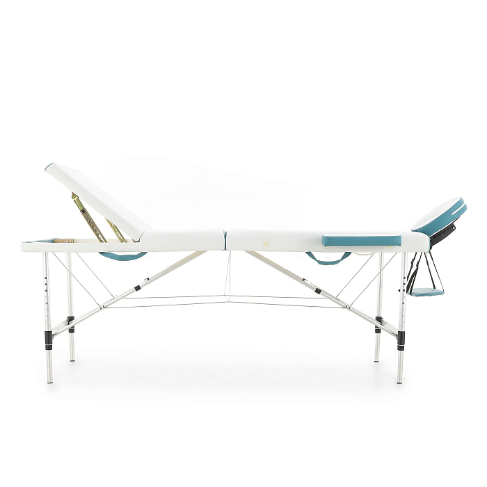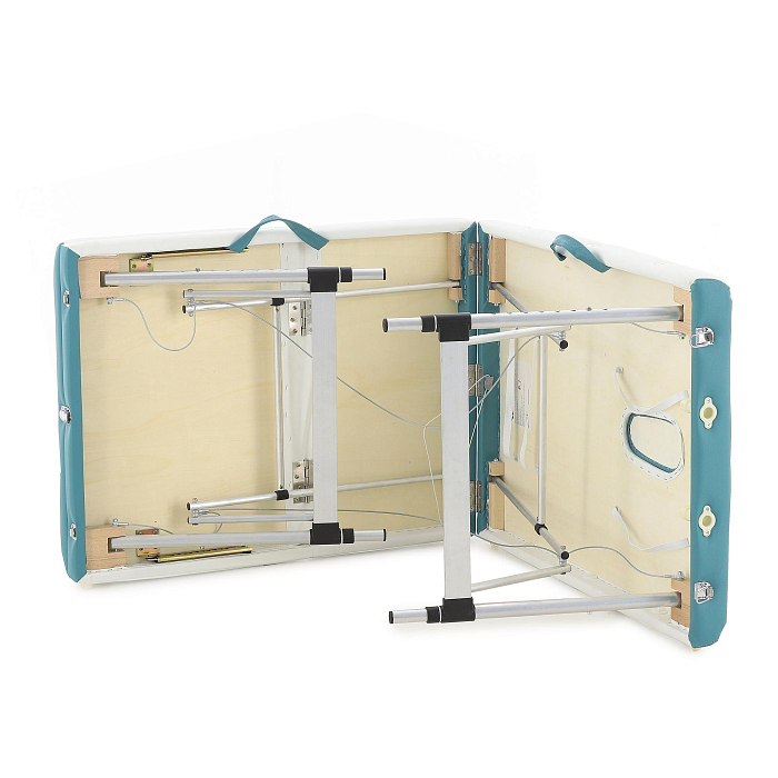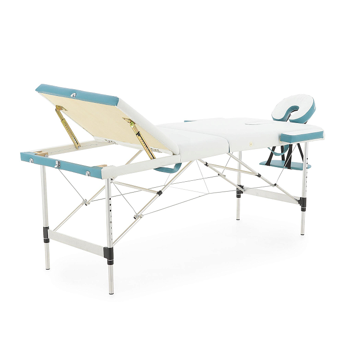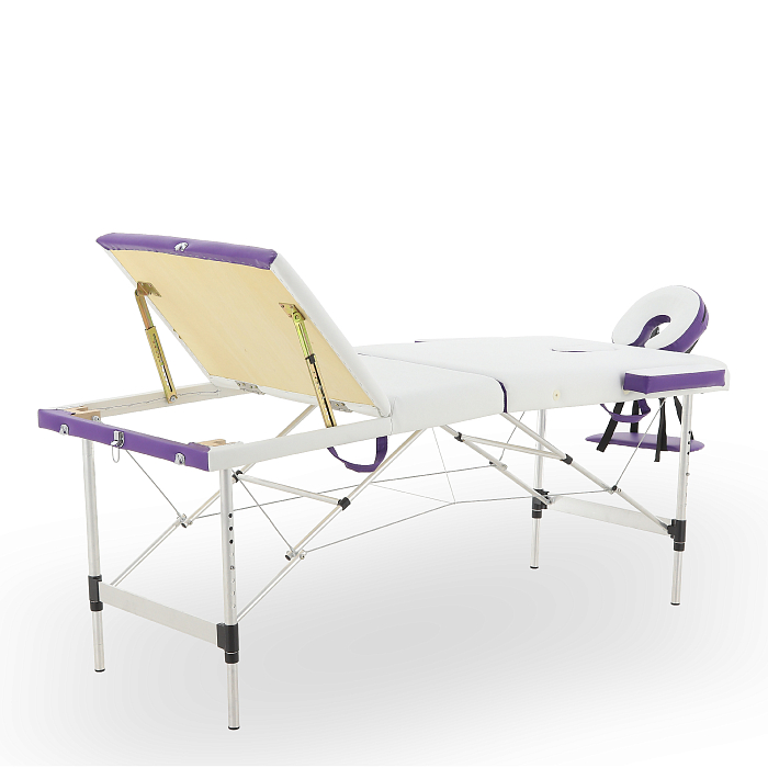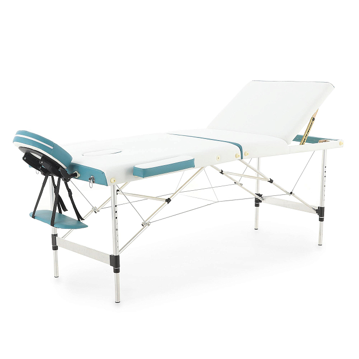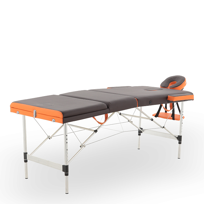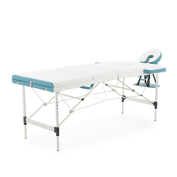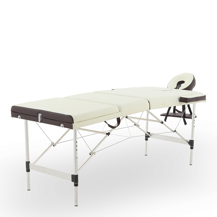 - Трёхсекционный массажный стол, рама которого изготовлена из прочного алюминия. Выдерживает повышенную нагрузку до 220 кг, при собственном относительно небольшом весе.