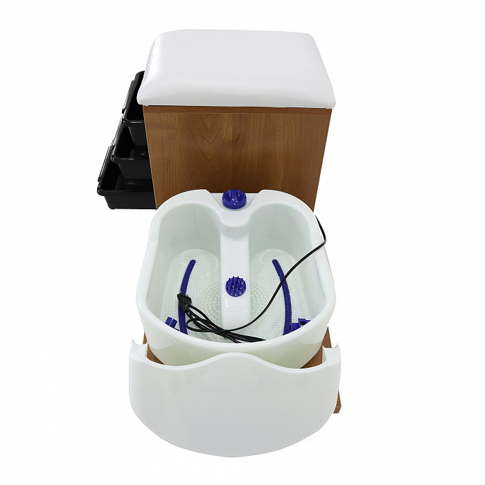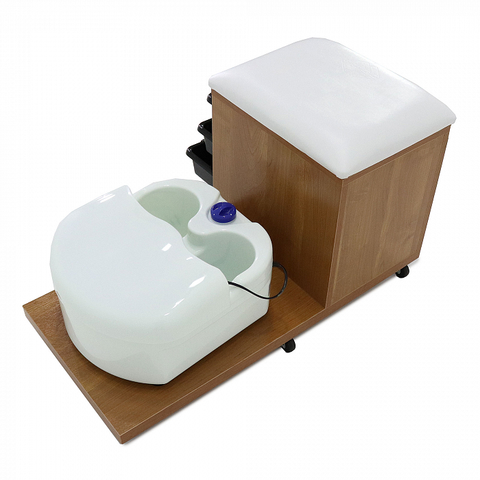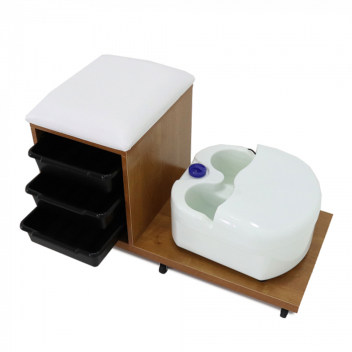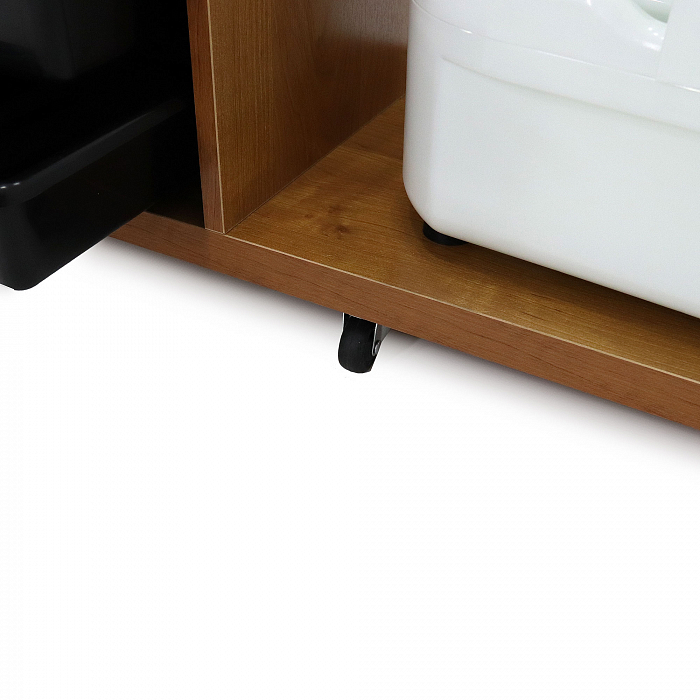 Тумба оборудована тремя вместительными лотками, сделанными из пластика. Они позволят хранить все необходимое оборудование или расходные материалы. Таким образом, все будет под рукой, не нужно тратить время на поиски и подготовку рабочего места. Есть дополнительное место под ножную ванночку. Оно прорезинено, поэтому ванночка не будет соскальзывать.