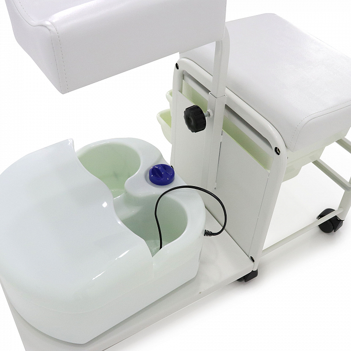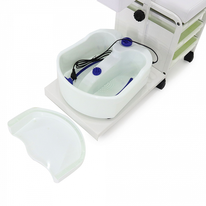 Тумба оборудована тремя вместительными лотками, сделанными из пластика. Они позволят хранить все необходимое оборудование или расходные материалы. Таким образом, все будет под рукой, не нужно тратить время на поиски и подготовку рабочего места. Есть дополнительное место под ножную ванночку. Оно прорезинено, поэтому ванночка не будет соскальзывать. Специальная подножка с возможность регулирования высоты позволит создать полноценное рабочее место, купив всего один элемент оборудования.