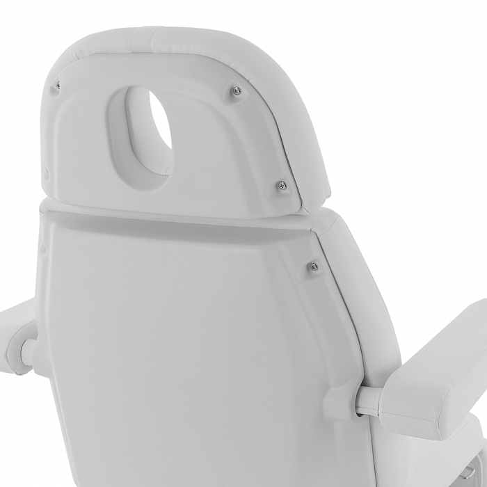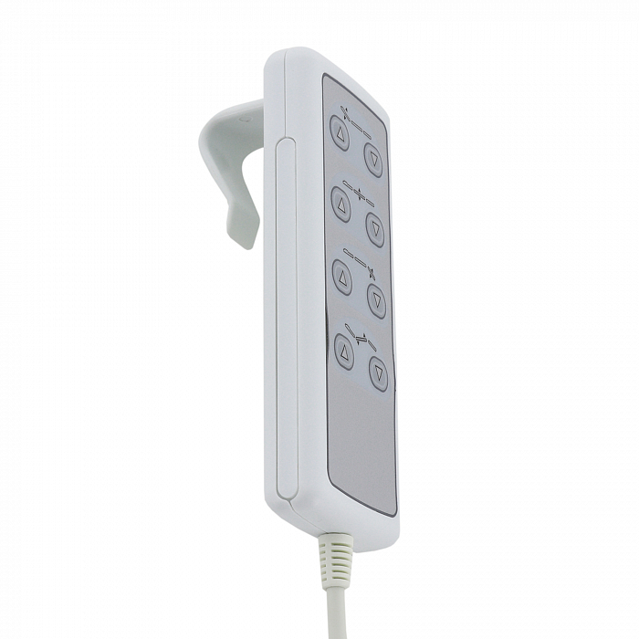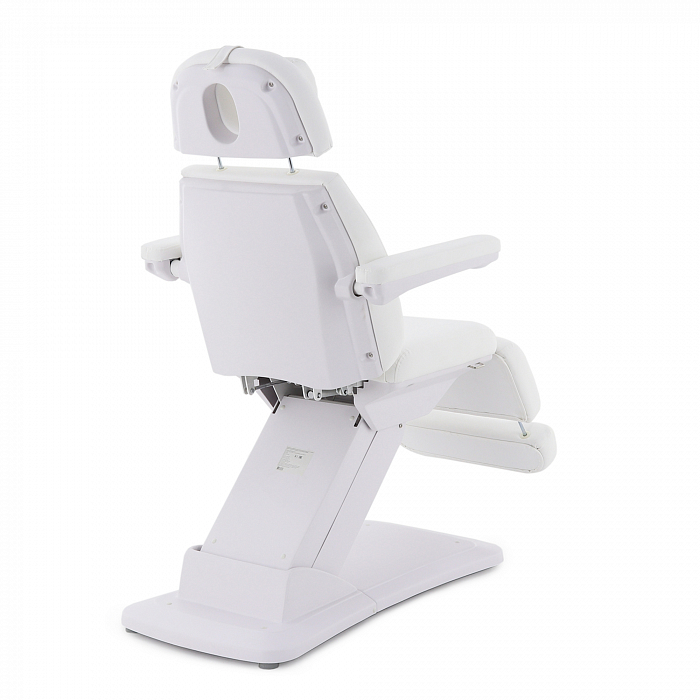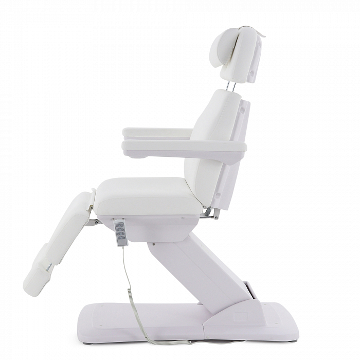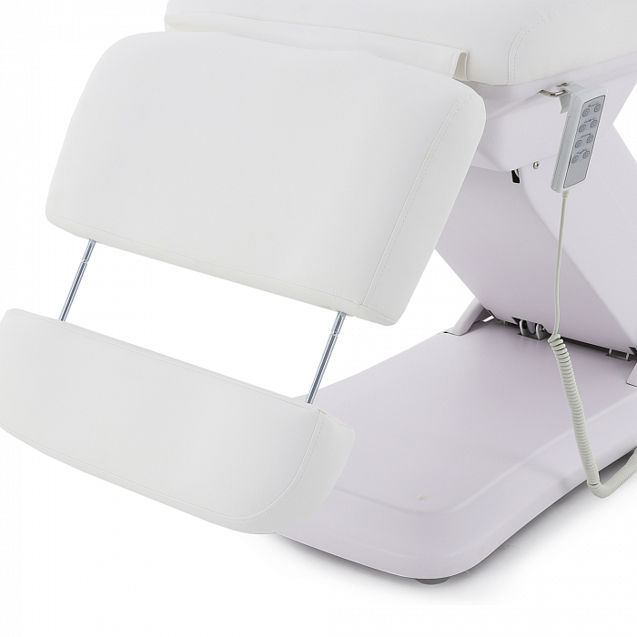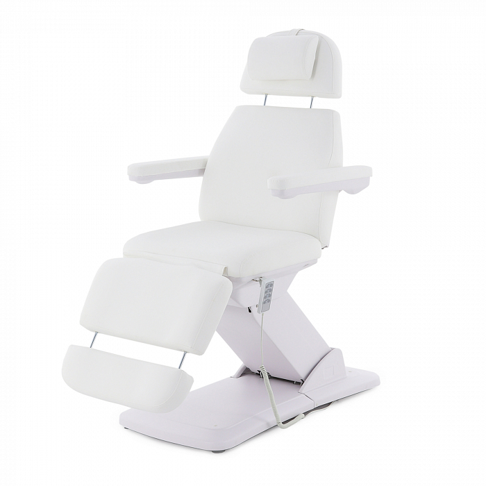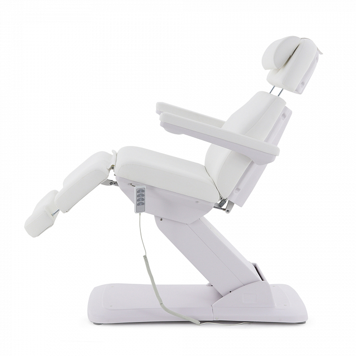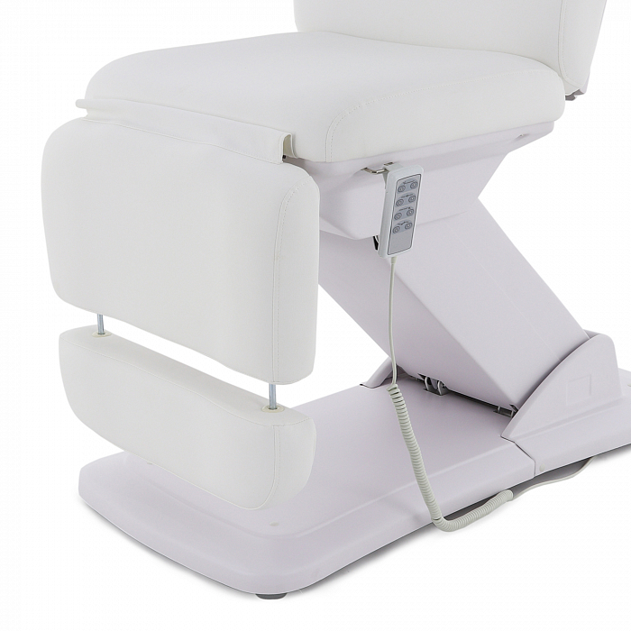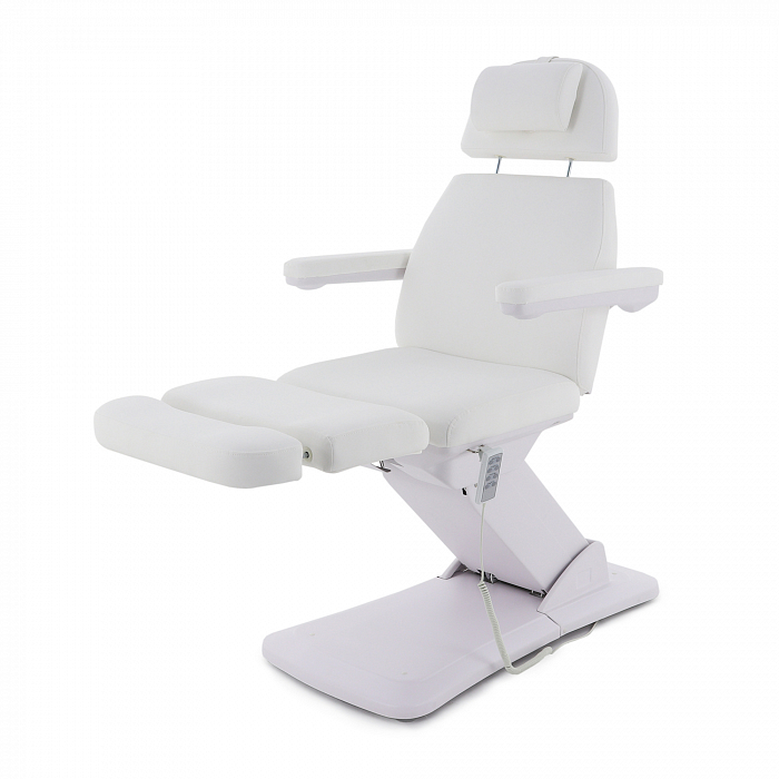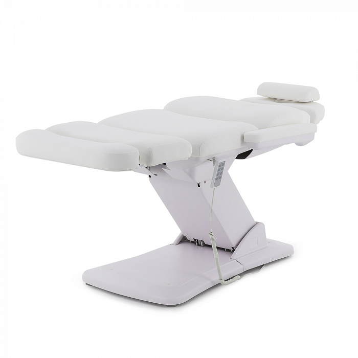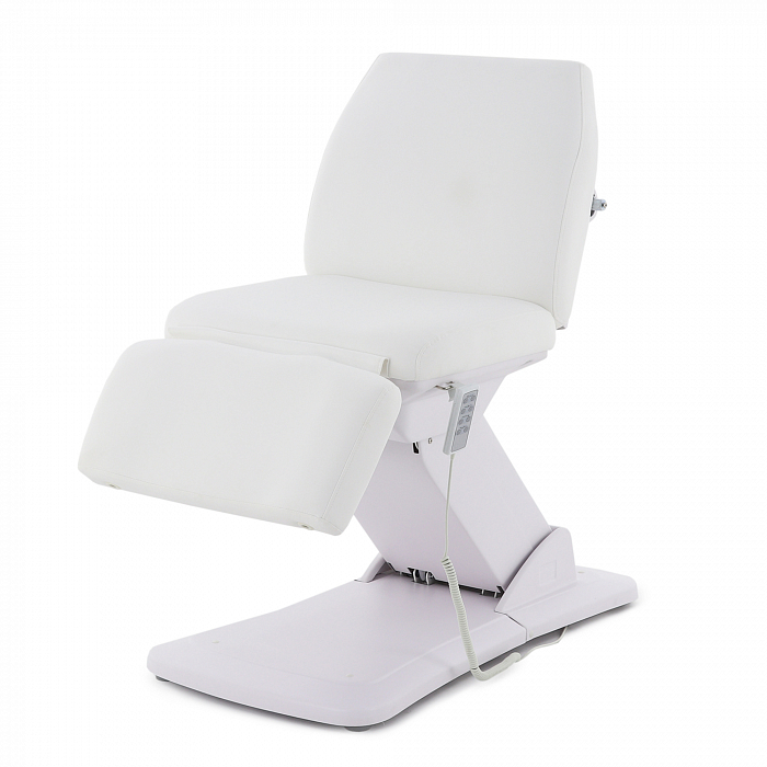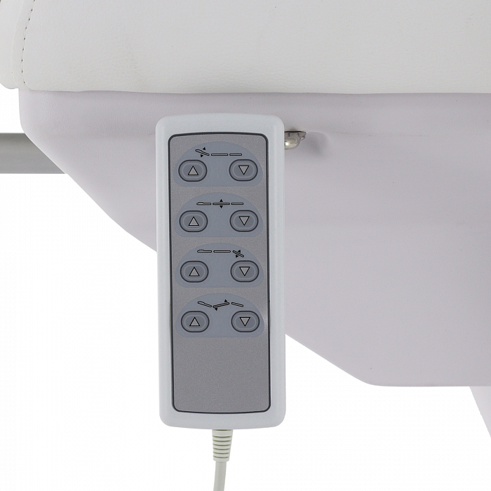 Изделие имеет прочную стальную раму, которая без труда выдерживает нагрузку в 180 кг. Учитывая, что средний вес россиян варьируется от 69 до 75 кг, кресло подойдёт клиенту любой комплекции. Модель имеет многосекционное ложе и 4 мотора для удобной регулировки угла наклона подвижных элементов. Широкий диапазон настроек позволяет специалисту подбирать оптимальное положение для каждого вида задач. Управление оборудованием производится с помощью удобного, интуитивно понятного пульта, оснащённого мембранными кнопками для защиты от влаги.