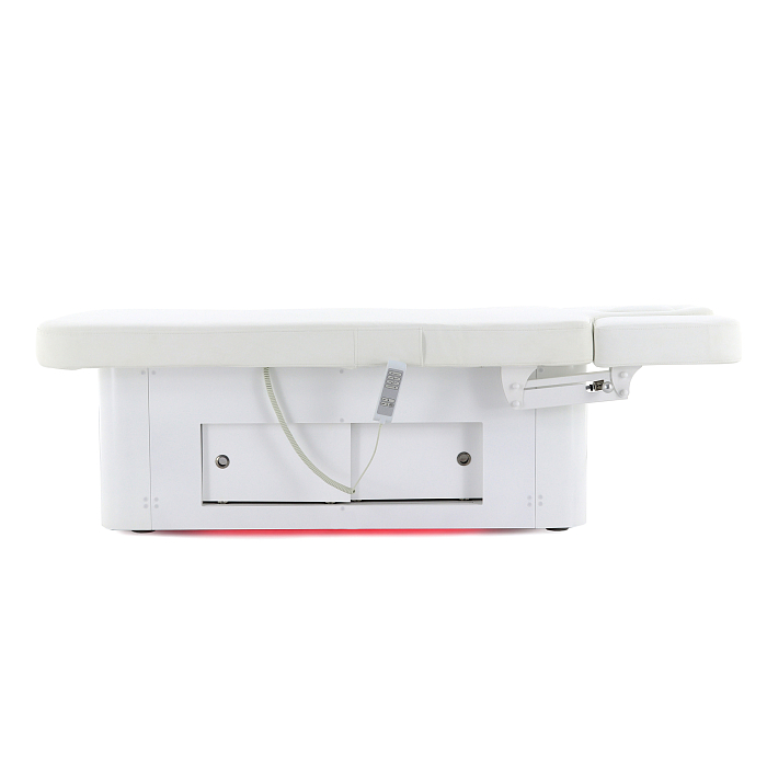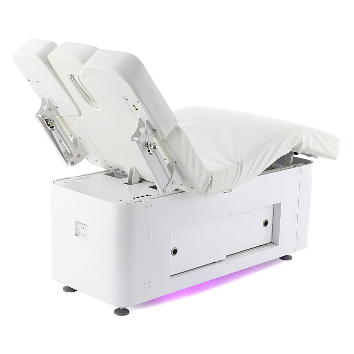 Широкие и удобные подлокотники, интегрированные в секцию спины, имеют регулировку по высоте. Они помогают удобно расположить руки пациента при проведении массажа спины, снять напряжение в предплечьях и зоне лопаток. Наличие декоративной подсветки в нижней части основания создаёт приятную, расслабляющую обстановку.