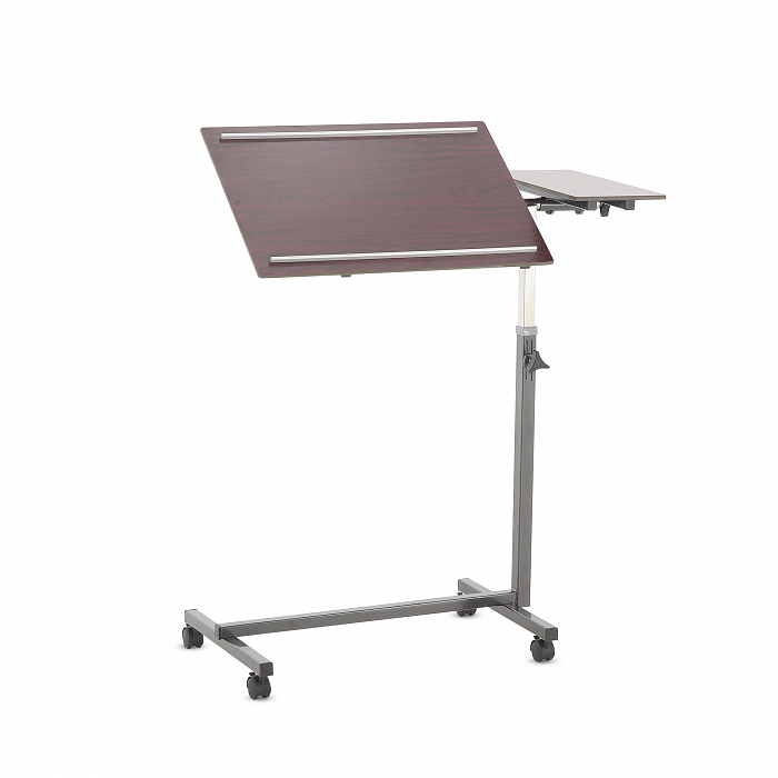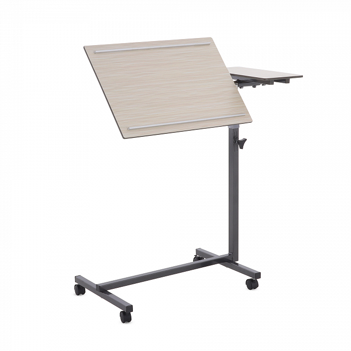 - Экземпляры бывают передвижными и стационарными. Образцы отличаются по наличию или отсутствию бортиков, удерживающих предметы на плоскости, по углу наклона, материалам производства, габаритам. Столики могут продаваться вместе с тумбой.
