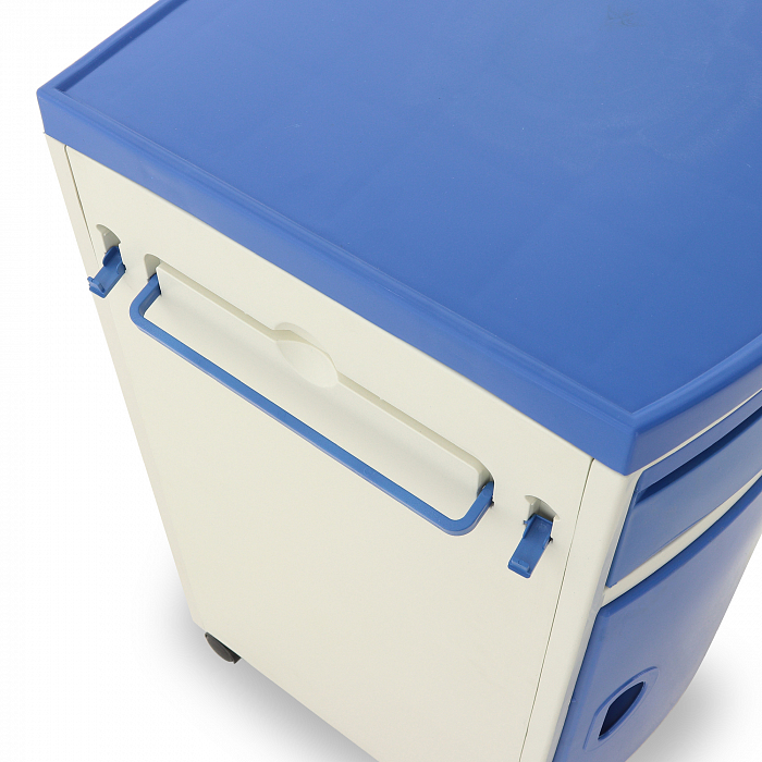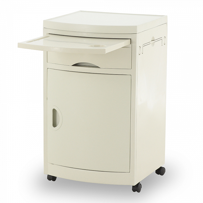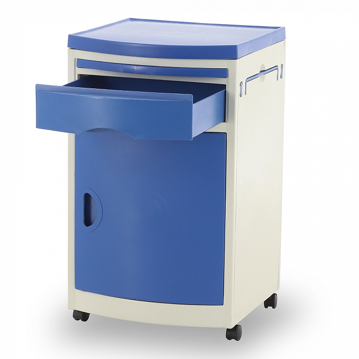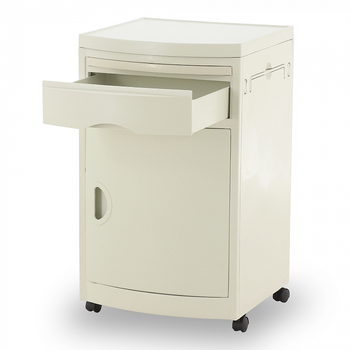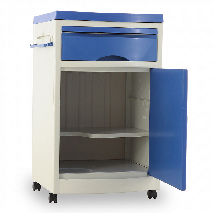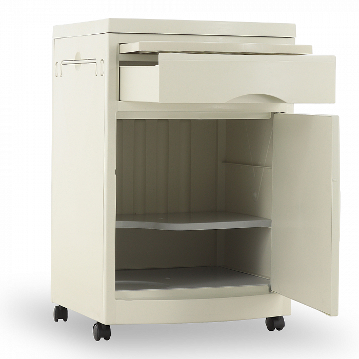- Мебель используется для хранения лекарств, личных вещей и белья. Колеса позволяют без труда передвигать приспособление. Конструкции устанавливаются возле кровати пациента.