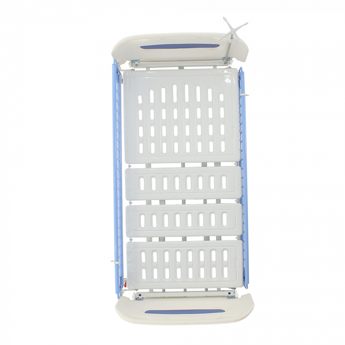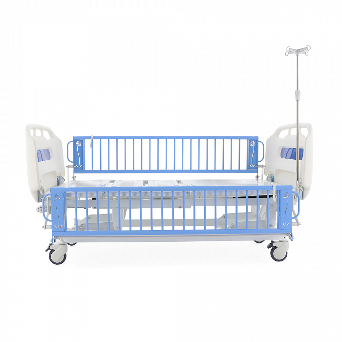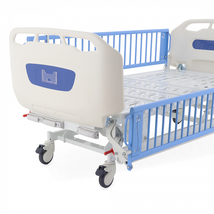 Детская механическая кровать в оригинальном современном дизайне – отличное решение для педиатрических отделений. Ложе кровати состоит из 4 секций, 3 из которых подвижны. В модели предусмотрено изменение угла наклона спинной, бедренной и икроножной секций, а также регулировка высоты кровати в диапазоне от 500 до 770 мм. Каждая секция ложа снабжена вентилируемыми отверстиями для поддержания гигиены и комфортного микроклимата спального места.