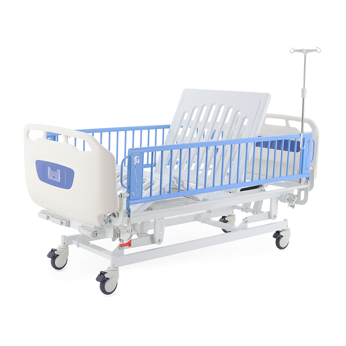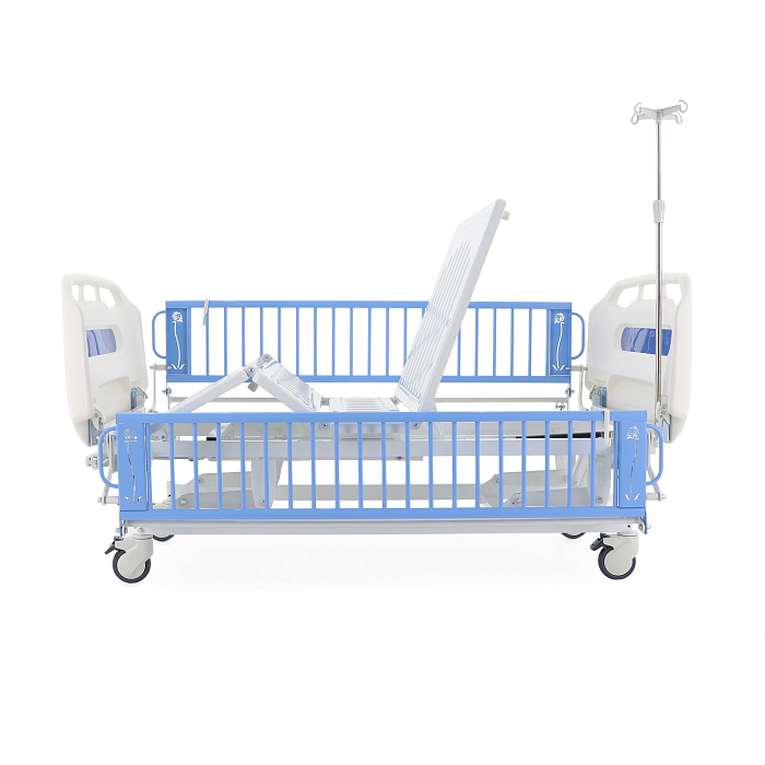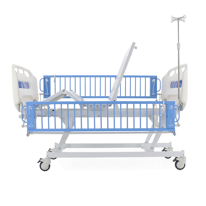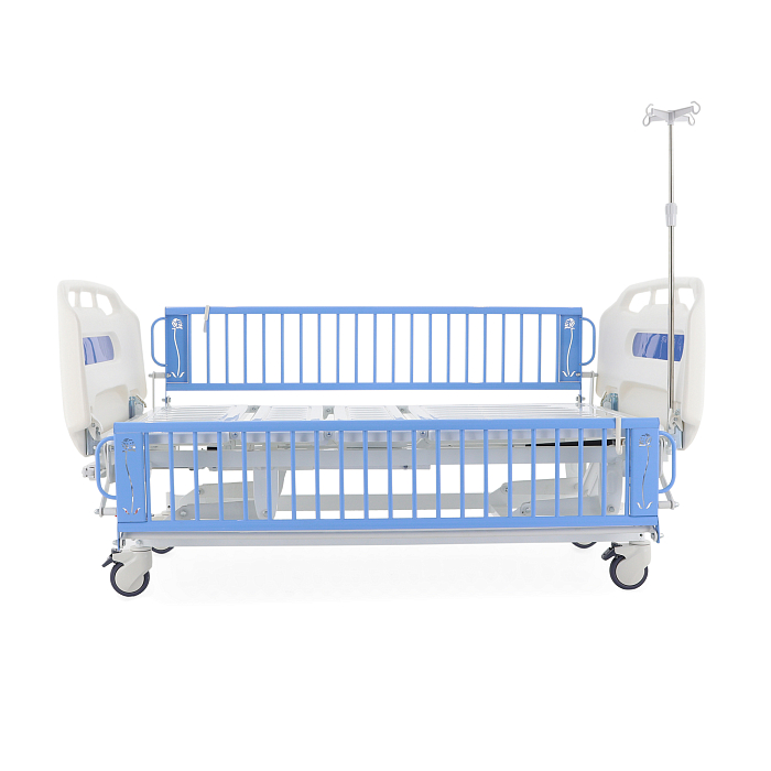Детская механическая кровать в оригинальном современном дизайне – отличное решение для педиатрических отделений. Ложе кровати состоит из 4 секций, 3 из которых подвижны. В модели предусмотрено изменение угла наклона спинной, бедренной и икроножной секций, а также регулировка высоты кровати в диапазоне от 500 до 770 мм. Каждая секция ложа снабжена вентилируемыми отверстиями для поддержания гигиены и комфортного микроклимата спального места.