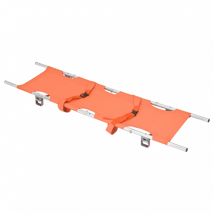 - Каркас носилок изготовлен из сплава алюминия высокой прочности, оборудован четырьмя складывающимися опорами, полотно из специальной ткани которая легко дезинфицируется.