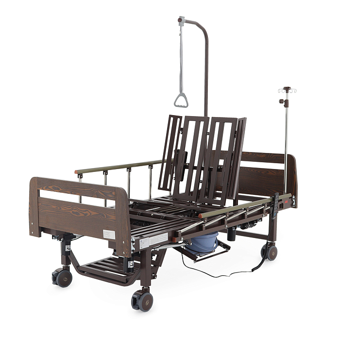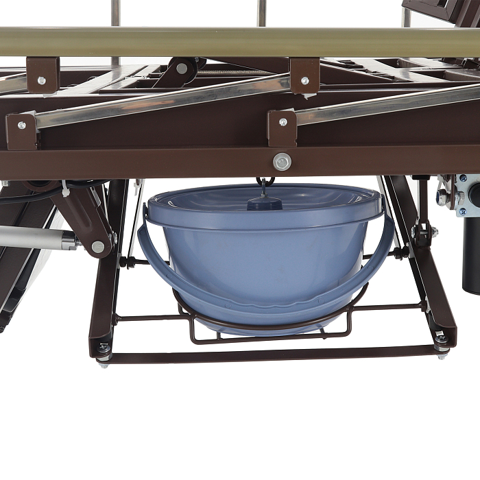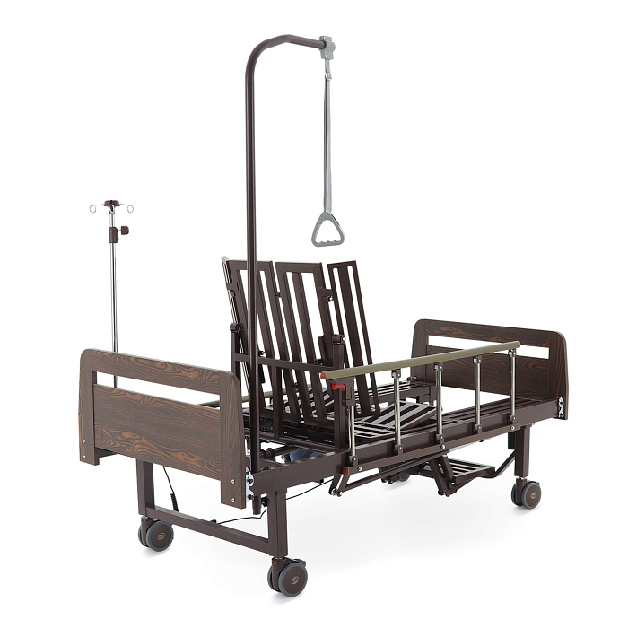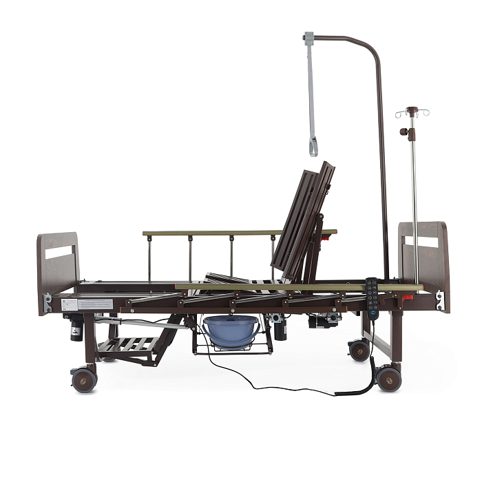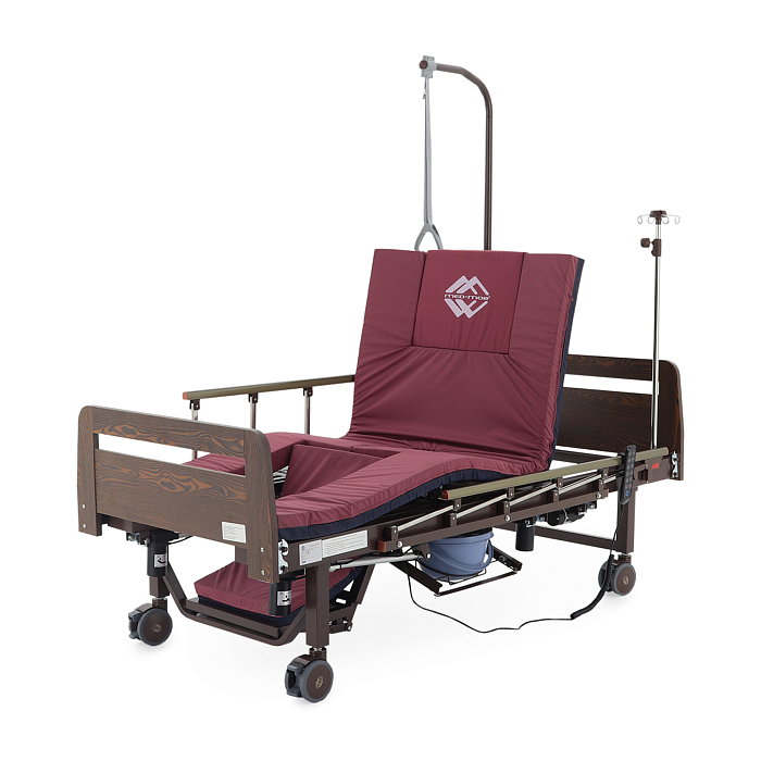 Кровать имеет встроенное туалетное устройство, а также функцию кардиокресла. Есть боковое переворачивание. В комплекте – удобный матрас и прикроватный столик. Все это позволит создать максимально комфортные условия для пациента. Кровать оснащена поручнями и колесами для передвижения.