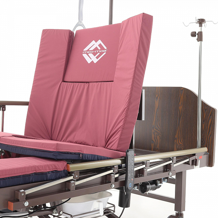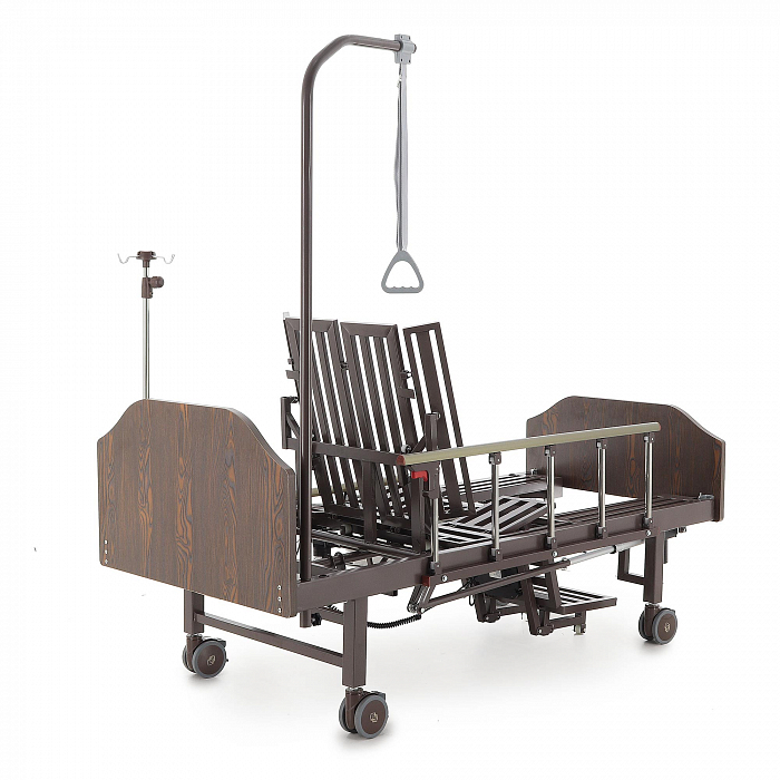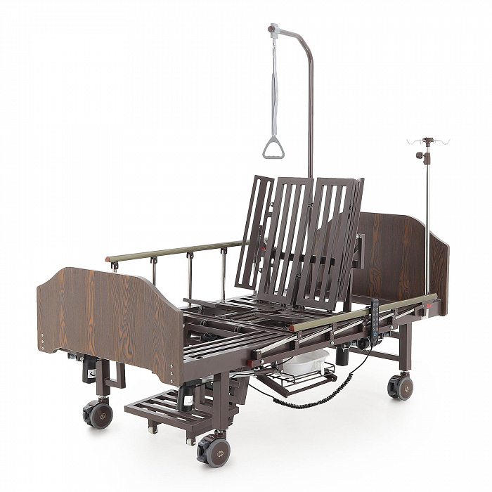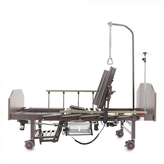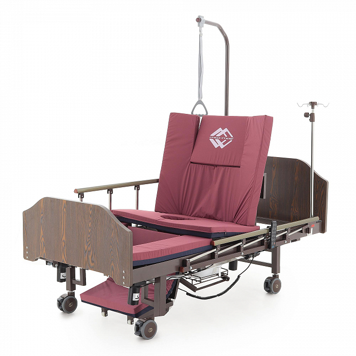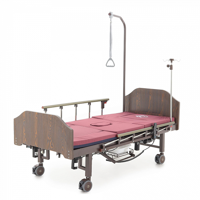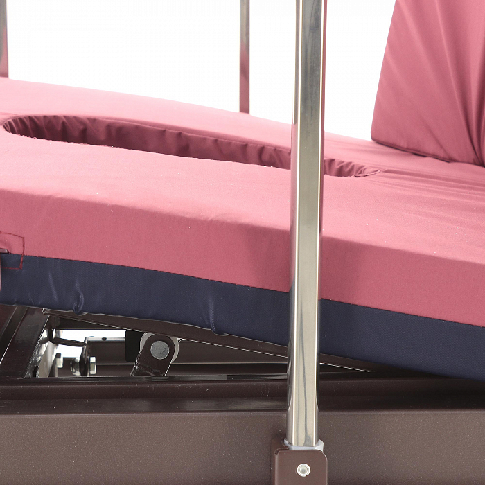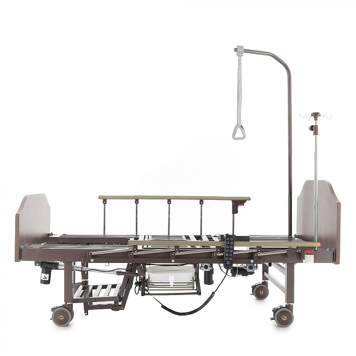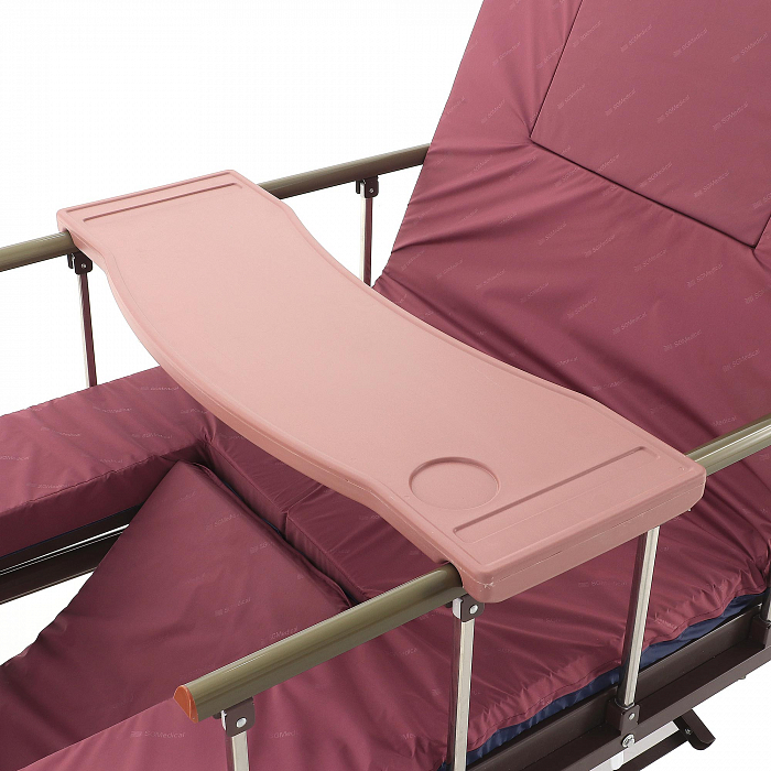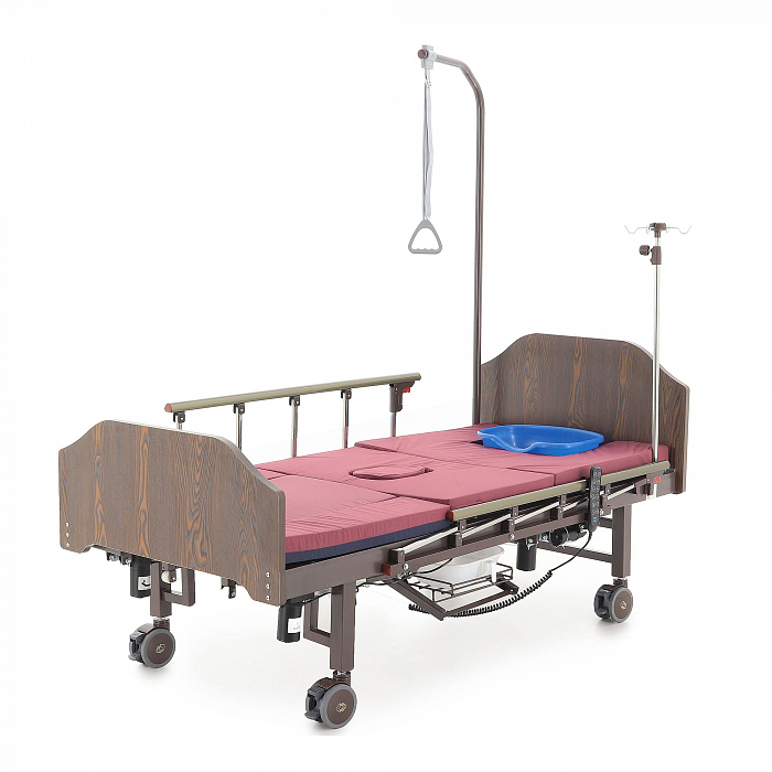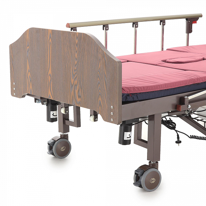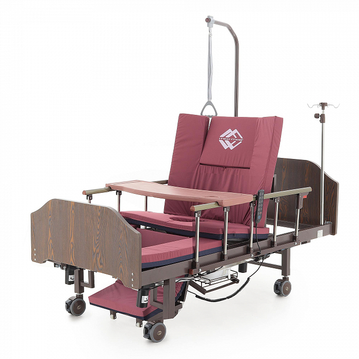 Кровать имеет встроенное туалетное устройство, а также функцию кардиокресла. Есть боковое переворачивание. В комплекте – удобный матрас и прикроватный столик. Все это позволит создать максимально комфортные условия для пациента. Кровать оснащена поручнями и колесами для передвижения.